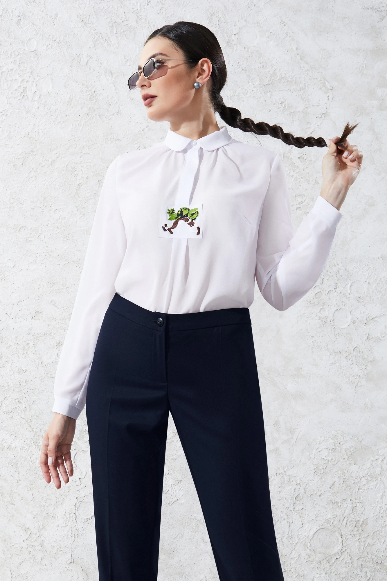 Жакет со стояче отложным воротником и центральной застёжкой на петли и пуговицы. Перед с карманами с клапанами в нижней части. Спинка со средним швом и двумя рельефами. Рукава втачные. Жакет на подкладке. Блузка со стояче отложным воротником, центральной застёжкой на петли, потайные пуговицы и одну декоративную пуговицу. Перед с вышивкой по центру. Спинка с отрезной кокеткой. Рукава втачные, с манжетами и с застёжкой на петли и пуговицы по низу. Брюки на притачном поясе.