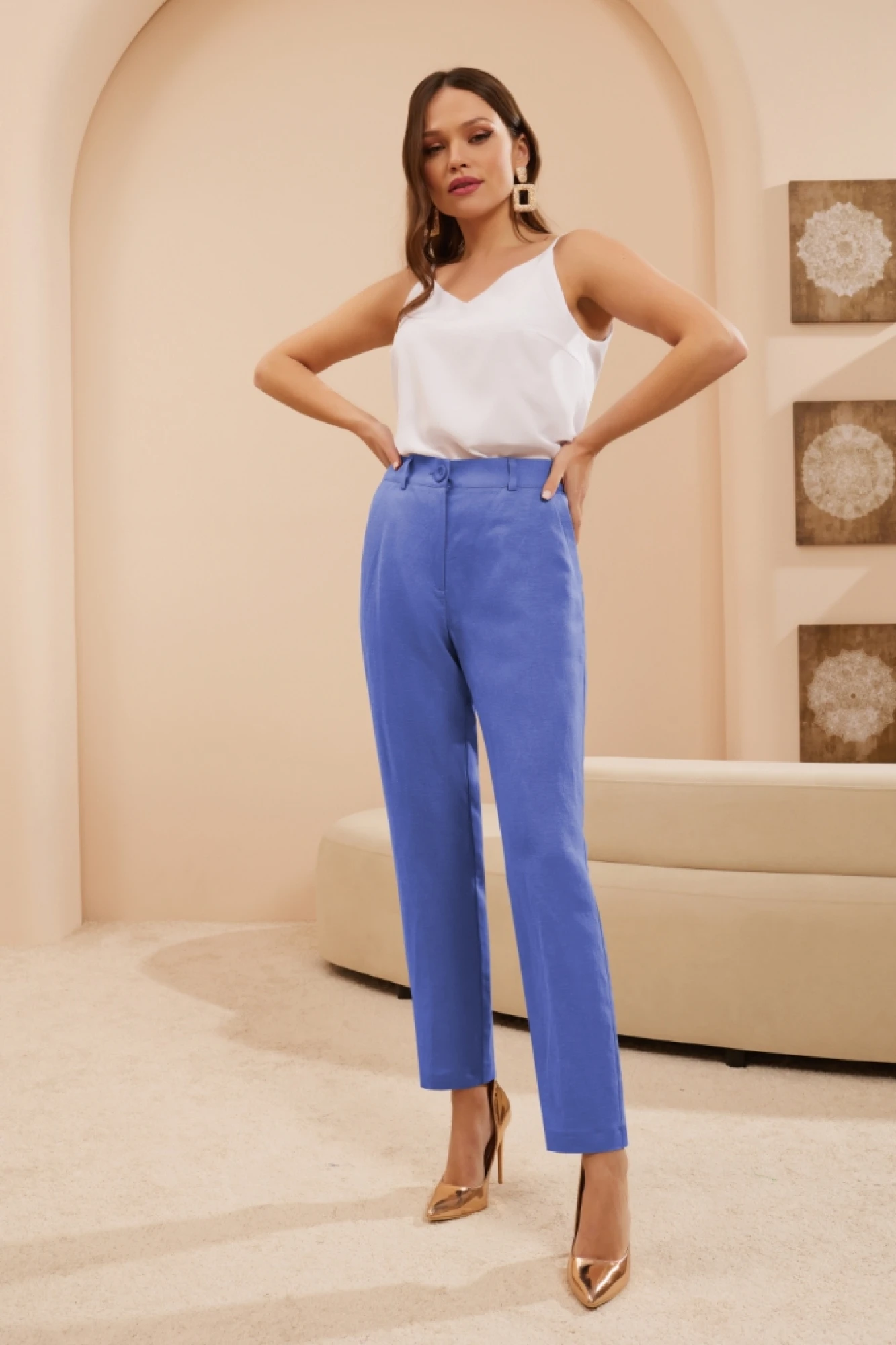Брюки на притачном поясе и частично на резинке. Передние половинки с наклонными карманами к боковым швам.
