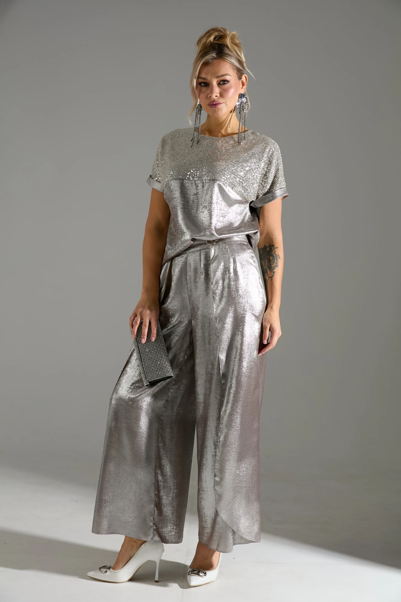 Блузка свободного объёма с короткими цельнокроеными рукавами с подворотами. Вырез горловины круглый. По переду подрез ниже линии груди. Верх блузки по переду выполнен из ткани расшитой пайетками.