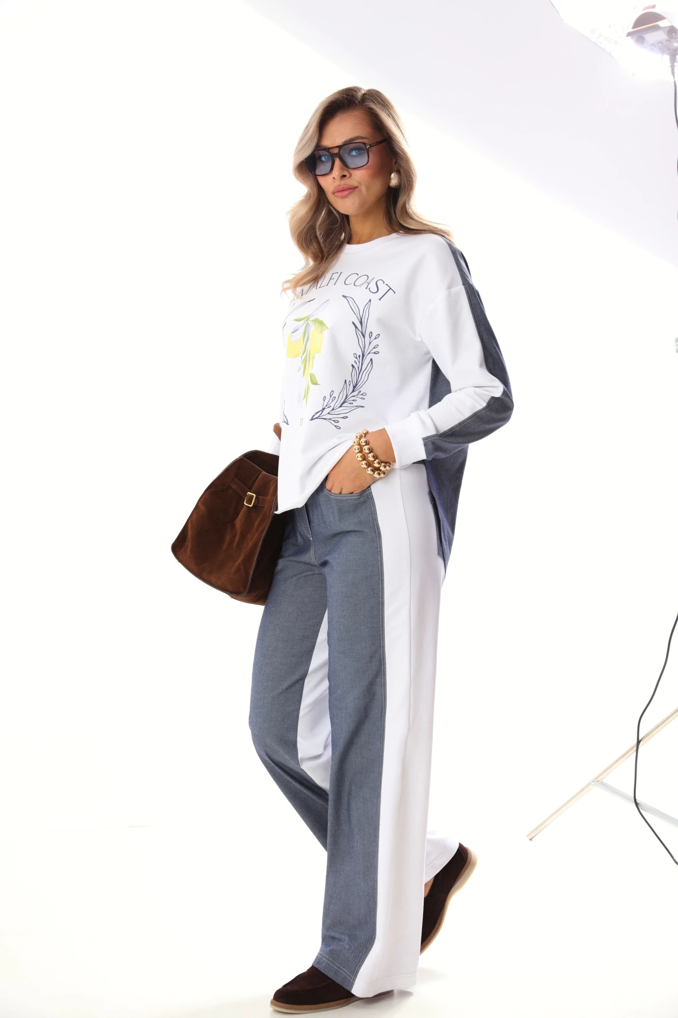 Комплект 2ка, состоящий из джемпера и брюк. Комплект выполнен из ткани двух видов. Джемпер объёмного кроя с принтом по переду. Спинка удлинённая, выполнена по принципу рубашки с кокеткой, по низу рукавов манжеты из довязов. Брюки свободного кроя от бедра. Талия брюк на резинке, по переду и сзади расположены карманы.