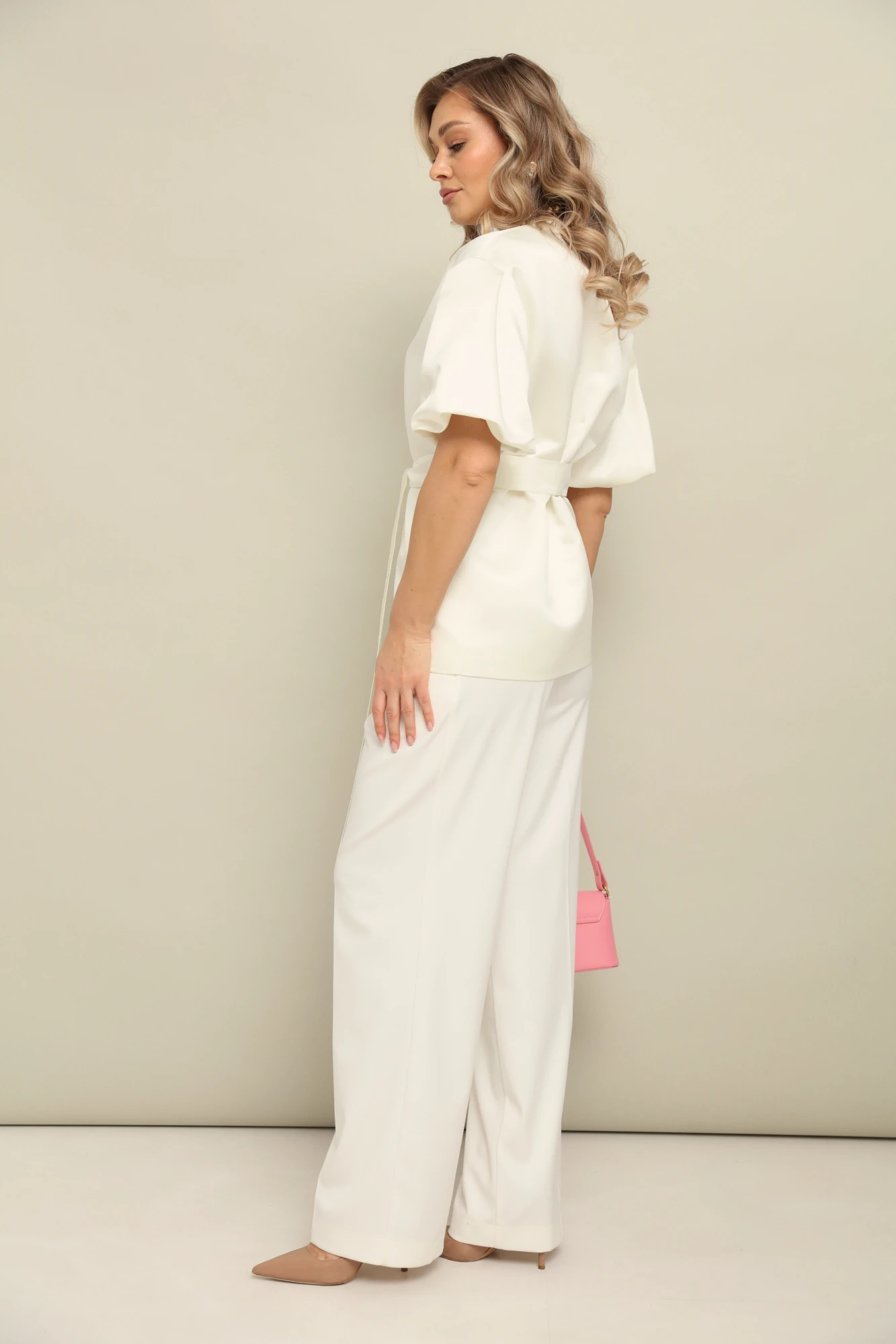 Комплект 2ка, состоящий из жакета и брюк. Легкий жакет на подкладке с объёмными рукавами. Перед на запах без застежки, под пояс по талии.Длина жакета 72-78 см. Брюки широкого объема, прямого силуэта. На передних половинках брюк заутюжены стрелки, переходящие в складки по линии талии. На задних половинках также заутюжены стрелки. В боковых швах расположены карманы. Застежка-гульфик. Пояс отрезной, притачной. В задней части пояса вставлена эластичная тесьма (резинка). На пояс настрочены шлевки. Выступающая часть пояса застегивается на петлю и крючок.