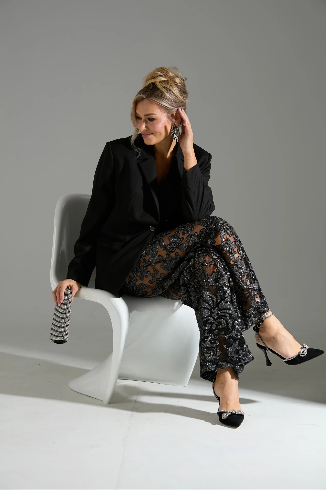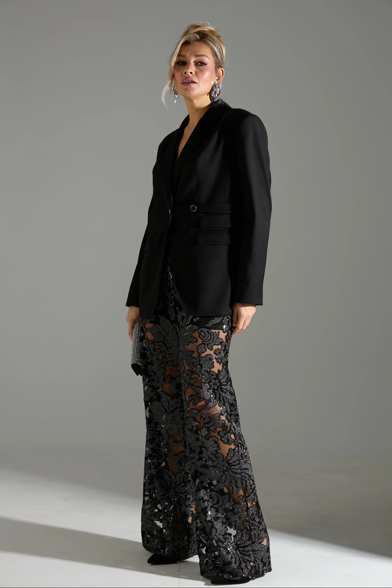 Комплект 2-ка, состоящий из жакета и брюк. Жакет однобортный объёмного силуэта с расширенным плечевым поясом. Застёжка на одну пуговицу. Из бокового шва выходит декоративная пата. По полочки распложены три прорезных кармана с клапанами, два из которых функциональные. Брюки прямые из полупрозрачной кружевной ткани расшитой пайетками, на эластичном поясе-резинке. Брюки дополнены подкладкой в виде шорт, закрывающих линию бёдер.