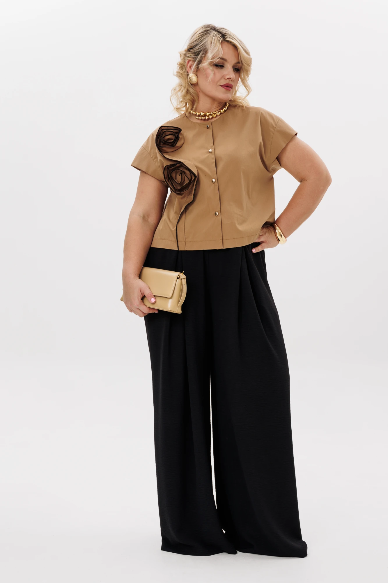 Комплект 2ка, состоящий из блузки и брюк. Укороченная блузка с короткими рукавами и застёжкой на пуговицы. Вырез горловины круглый. По переду блузки выполнен декор из основной ткани в виде цветов. Брюки широкого объема. По центру переда заложены две широкие встречные складки на каждой половинке. В боковых швах расположены карманы с наклонным входом. Талия на резинке.