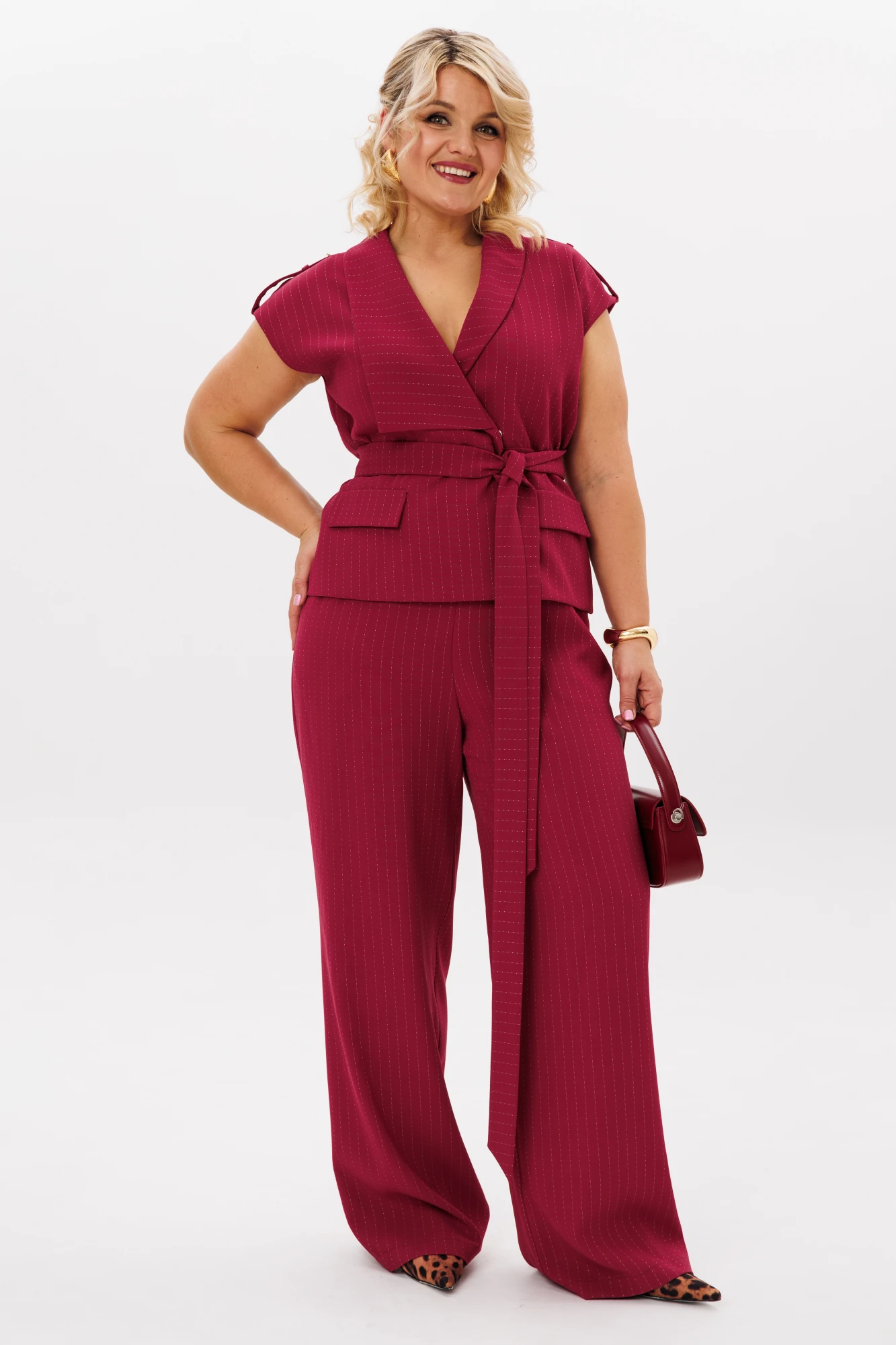 Комплект 2ка, состоящий из жилета и брюк. Жилет с отложным воротником и поясом. Перед жилета на запах с застёжкой на кнопки, на плечах декоративные паты. По бокам жилета выполнена имитация клапанов карманов. Брюки прямого силуэта на эластичной резинке по талии. По переду расположены карманы с наклонным входом.