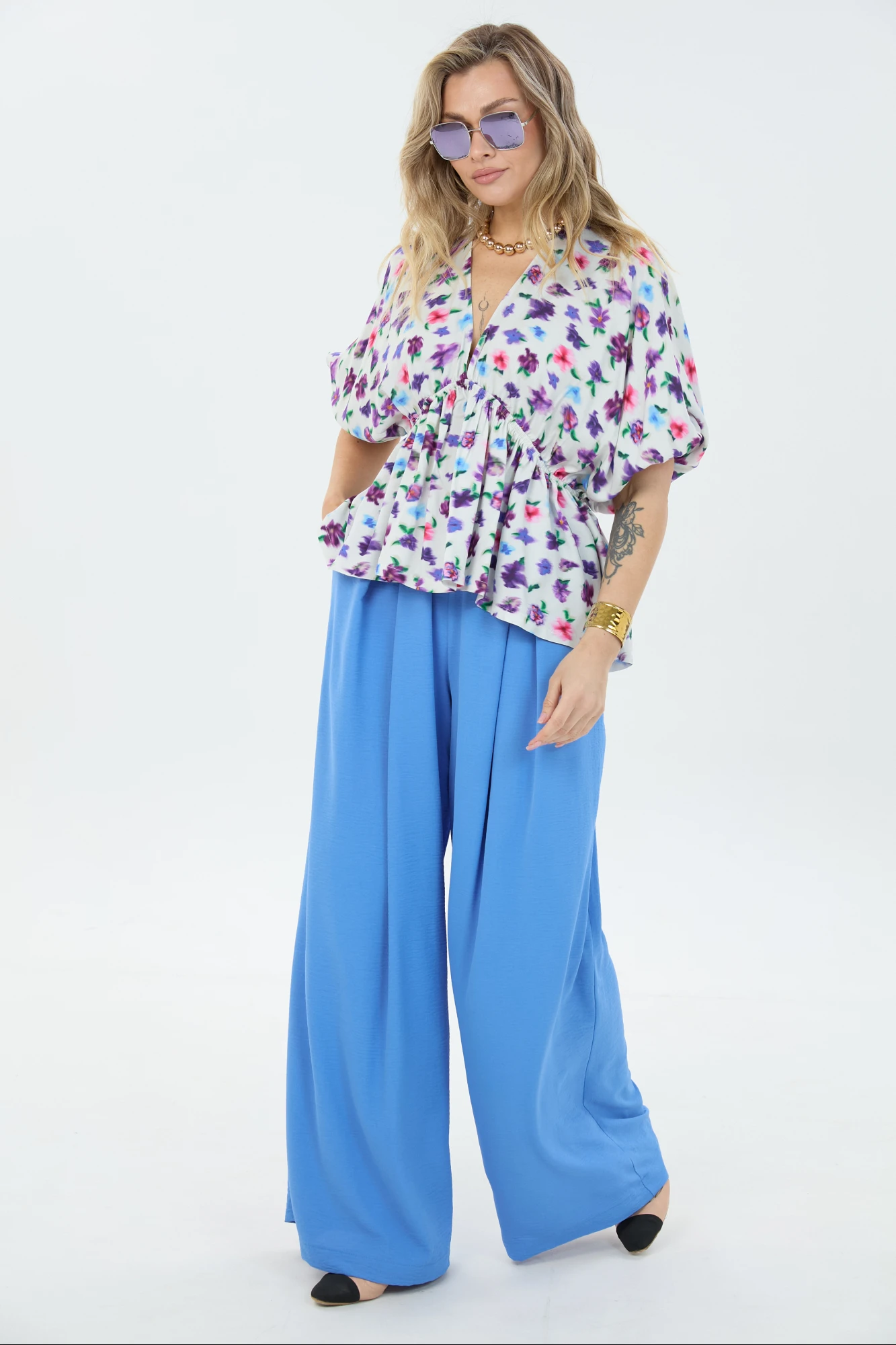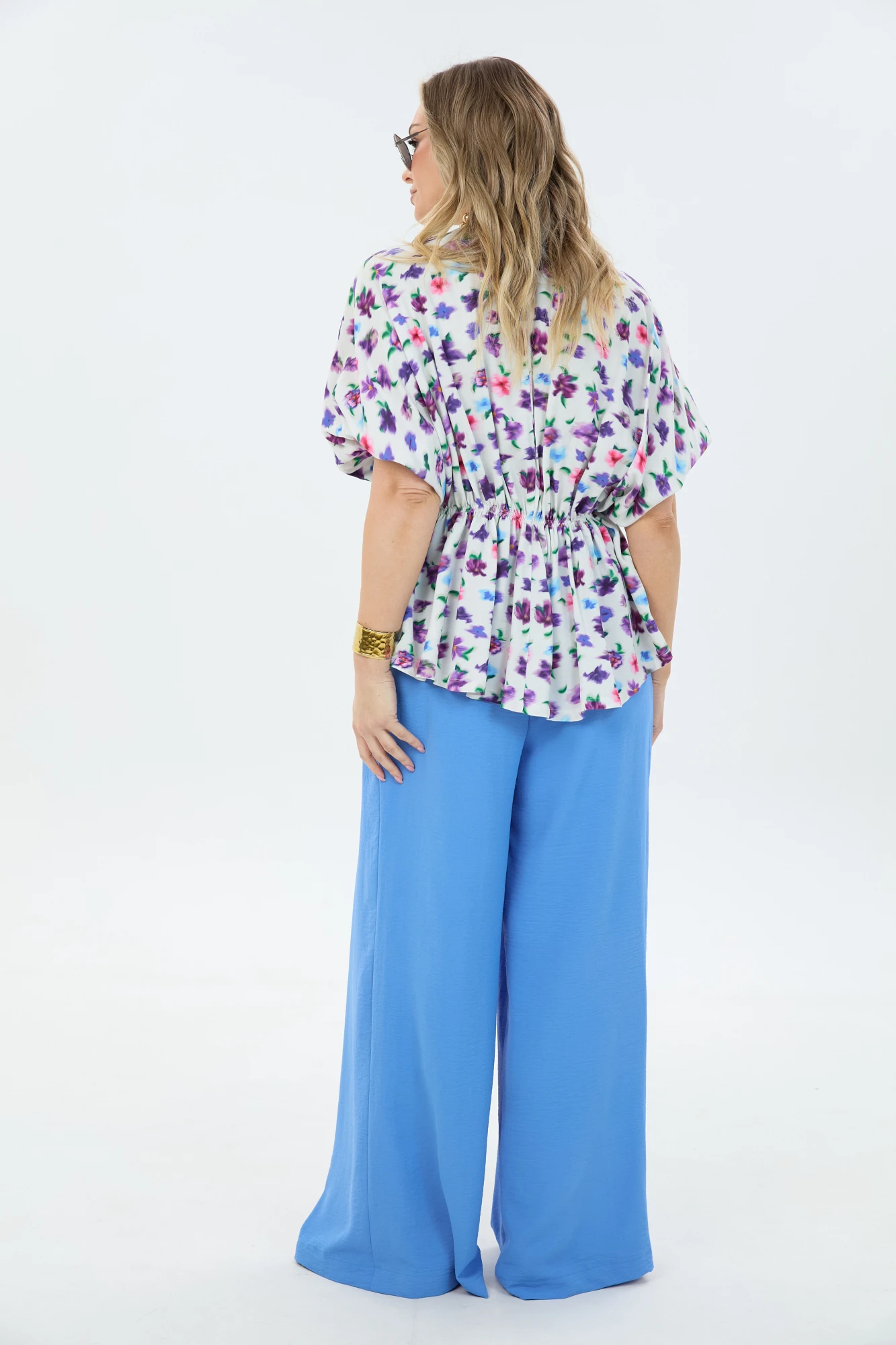 Комплект 2-ка, состоящий из лёгкой туники и брюк. Туника свободного силуэта с V-образным вырезом горловины. Рукав блузки цельнокроеный. Ниже линии груди вставлена эластичная резинка. Брюки широкого объема. По центру переда заложены две широкие встречные складки на каждой половинке. В боковых швах расположены карманы с наклонным входом. Пояс на резинке.