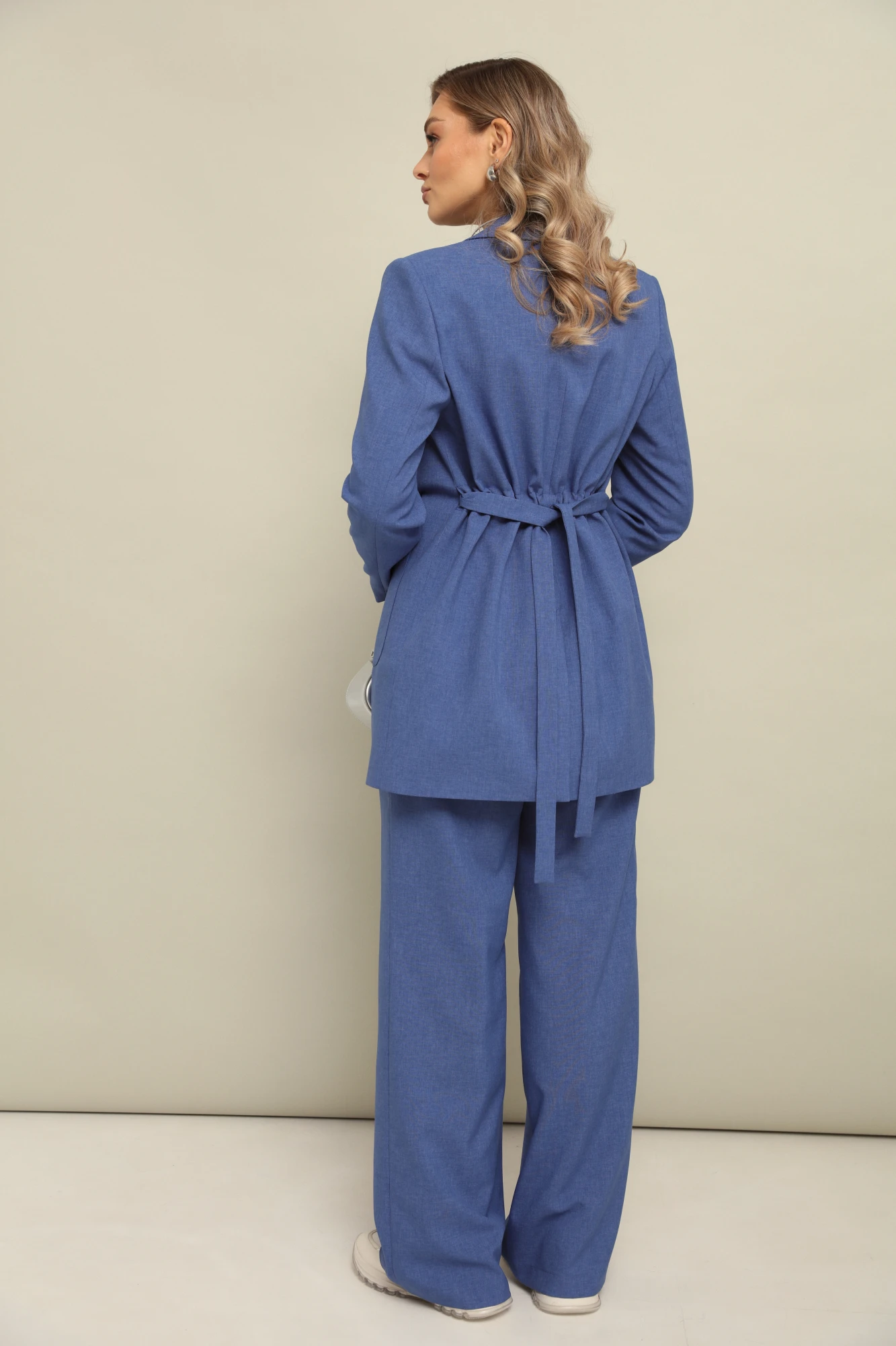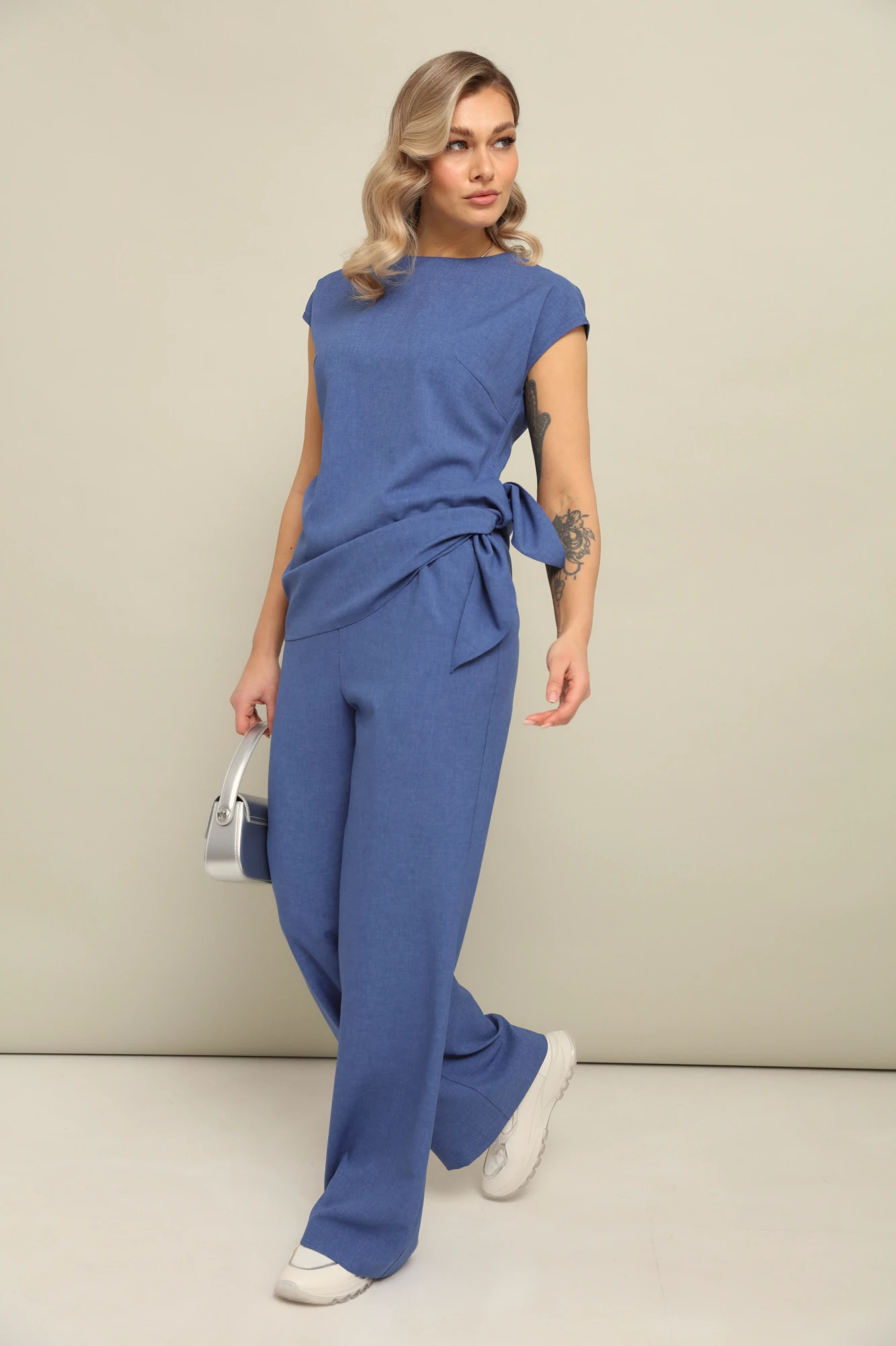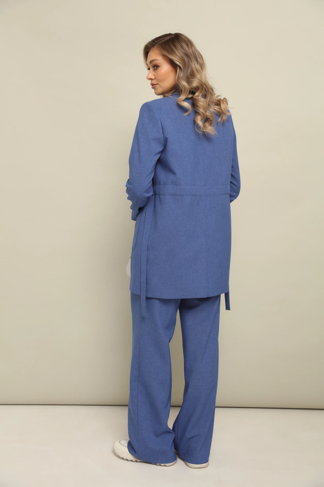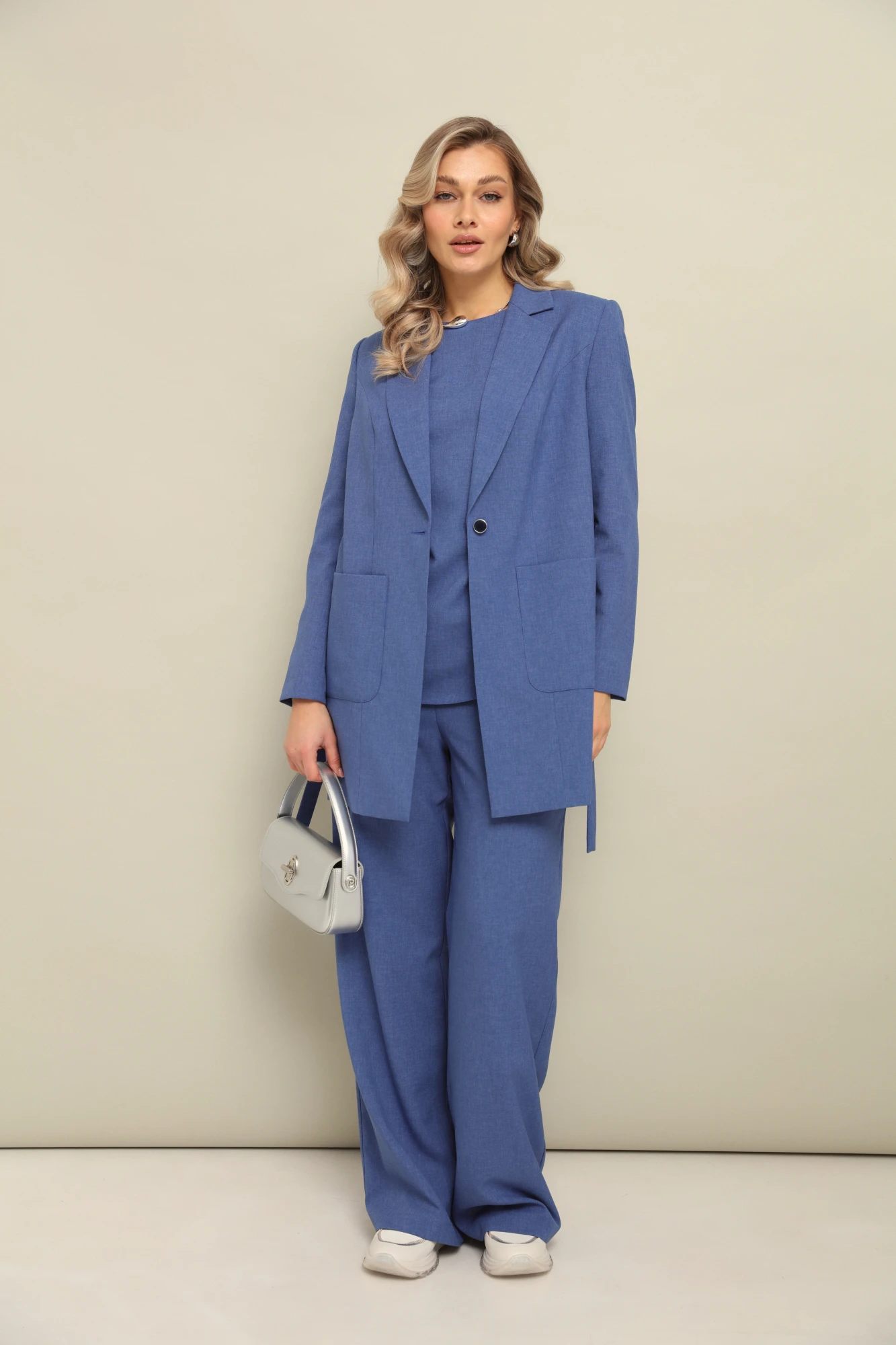 Костюм 3ка, состоящий из жакета, топ и брюк. Удлинённый однобортный жакет приталенно силуэта с застёжкой на пуговицу. По переду расположены накладные карманы. Жакет дополен поясом-кулисой, на которую можно собрать и приталить жакет по спинке. Топ с короткими рукавами и ассиметричным низом. Сбоку низ удлинен на завязки. Брюки прямого кроя свободного объёма от бедра, пояс на резке.По бокам карманы с наклонным входом.