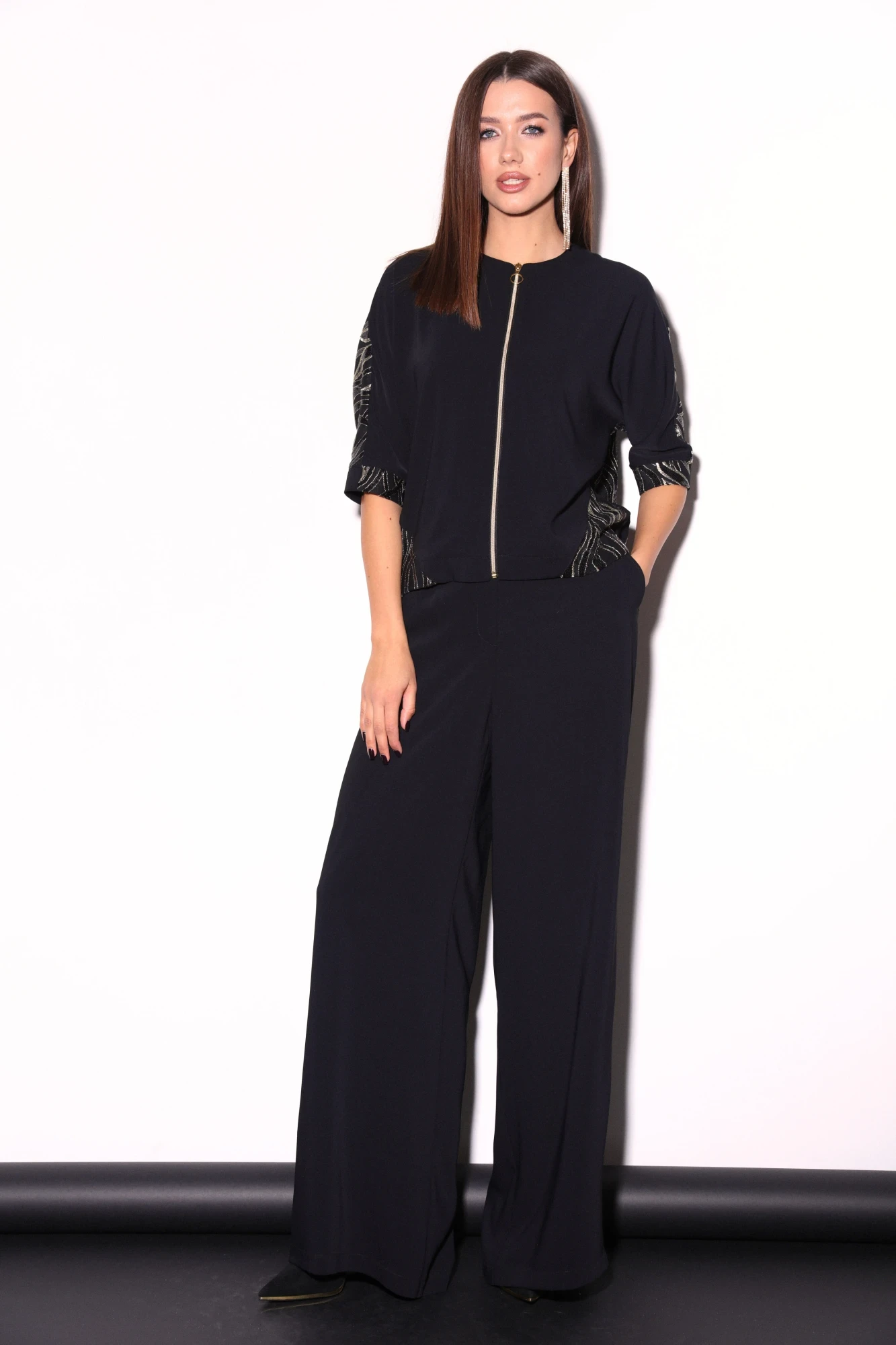 Костюм 2ка, состоящий из джемпера и брюк. Лёгкий джемпер на молнии свободного силуэта из ткани двух видов. Спинка джемпера декорирована вышивкой из пайеток. Рукава цельнокроеные чуть ниже локтя с имитацией манжеты. Джемпер облегченный, без подкладки и карманов, по низу на резинке. Брюки широкого объема, прямого силуэта. В боковых швах расположены карманы с наклонным входом. Застежка-гульфик. Пояс отрезной, притачной. В задней части пояса вставлена эластичная тесьма (резинка). Пояс застегивается на петлю и крючок.