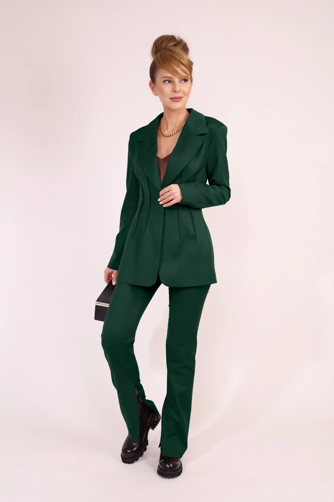 Тонкий шерстяной костюм вообще можно назвать универсальным, поскольку он подойдет для носки в любое время года. Дизайнеры экспериментируют с расцветками и фасонами, создавая новые идеалы. Жакет однобортный умеренного объема, приталенного силуэта. Силуэт изделия создается за счет отрезных бочков на спинке и полочке, а также за счет среднего шва и плечевых вытачек на спинке. На полочке нагрудная вытачка переведена в плечевой шов. Плечевой пояс расширен и поддерживается плечевыми накладками. Рукав втачной, длинный, двухшовный. Воротник отложной с отрезной стойкой, пиджачного типа. Застежка на уровне линии талии на одну петлю и пуговицу. Жакет полностью обработан притачной подкладкой. Длина изделия до середины бедер. Женские брюки малого объема, прямого силуэта. На передних половинках с обеих сторон расположены под наклоном нефункциональные прорезные карманы в рамку. На задних половинках расположены вытачки. Пояс отрезной. На поясе расположены шлевки. Застежка брюк – гульфик на молнии, на поясе крючок и петля. В нижней части шаговых швов оформлены высокие разрезы. Длина брюк ниже уровня щиколоток – увеличена с учетом высоты каблука.