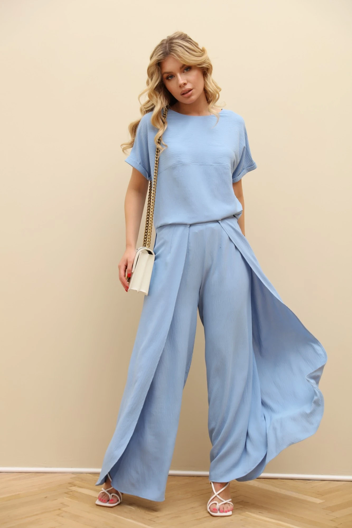 Комплект 2-ка из лёгкой ткани, состоящий из блузки и брюк.