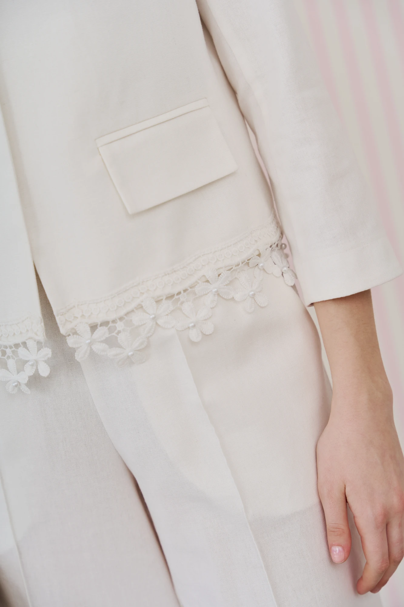 Костюм брючный. Жакет свободного кроя, по переду и спинке на хлопковой подкладке. Рукав втачной ¾. Воротник пиджачного типа, застежка на петли и пуговицы. По бокам прорезные карман с клапаном. По низу жакета ажурная тесьма с бисером. Брюки свободного кроя на притачном поясе на резинке, в боковых швах прорезные карманы, по низу отлетные шлицы.