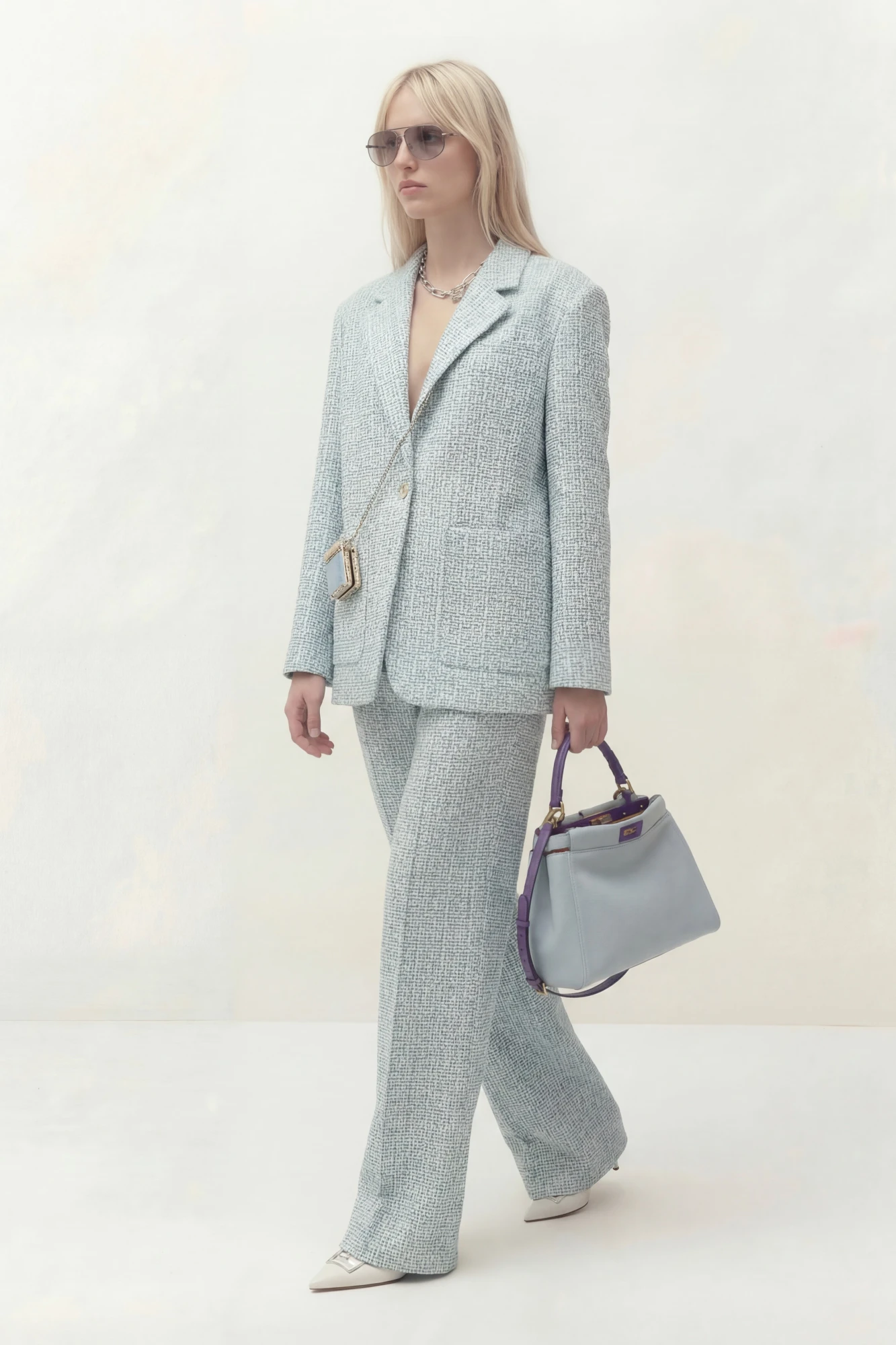 Комплект состоит из жакета и брюк. Жакет свободного кроя прямого силуэта на подкладке. Рукав втачной длинный, шлица по локтевому шву. Воротник пиджачного кроя, застежка однобортная на петли и пуговицы, по бокам накладные карманы. По спинке средний шов и рельефы. Брюки прямого силуэта с завышенной линией талии и цельнокроеным поясом, по бокам прорезные карманы. Застёжка на задней половине брюк по линии сидения. По переду брюк от линии пояса вертикальные защипы.