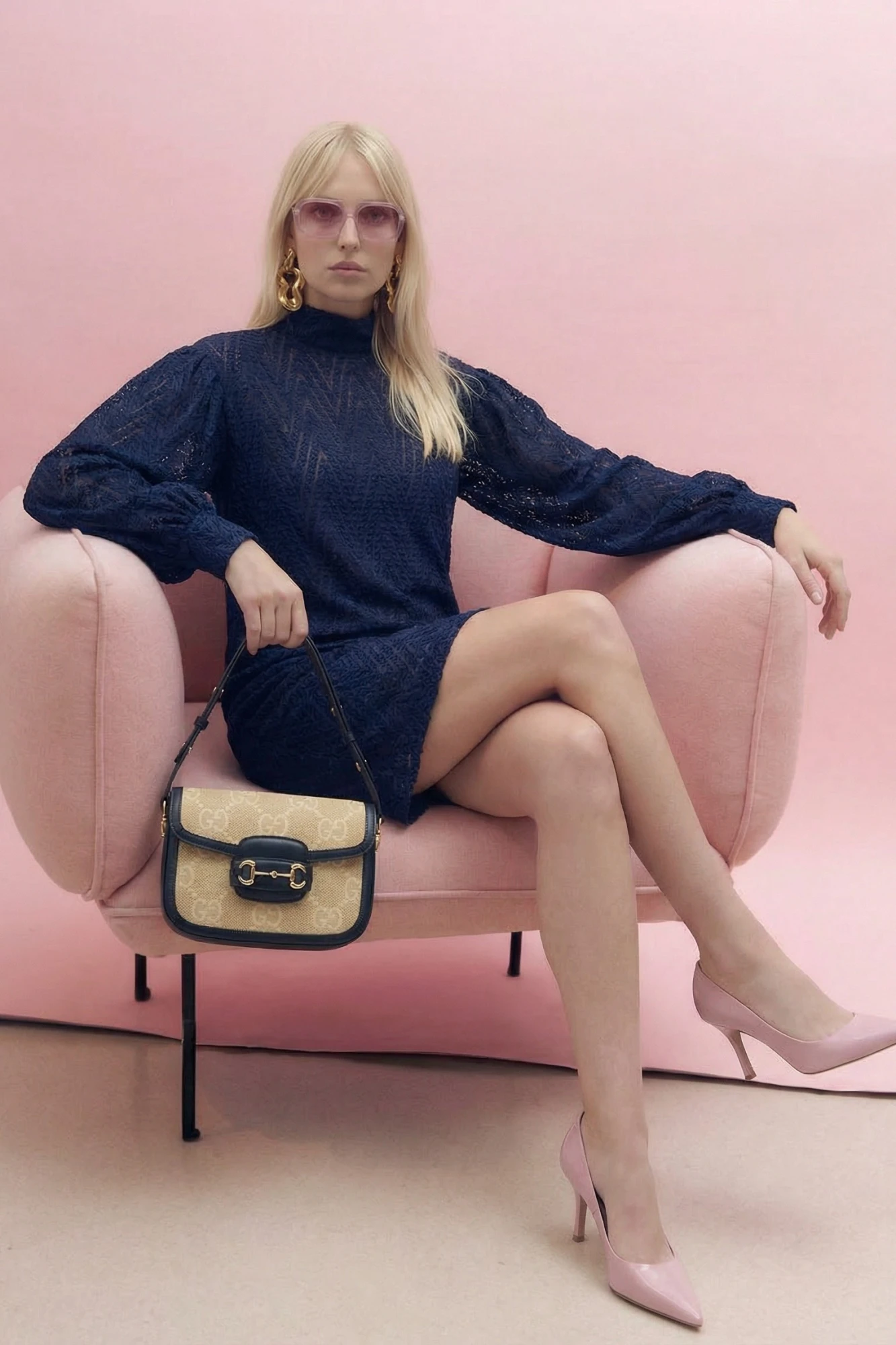 Платье силуэта «кокон». Имеет спущенную линию плеча, рукав длинный со сборкой по плечу и с манжетой по низу. В среднем шве спинки застежка на навесные петли-пуговицы. Воротник-стойка. Имеет второе платье-комбинацию на бретелях.