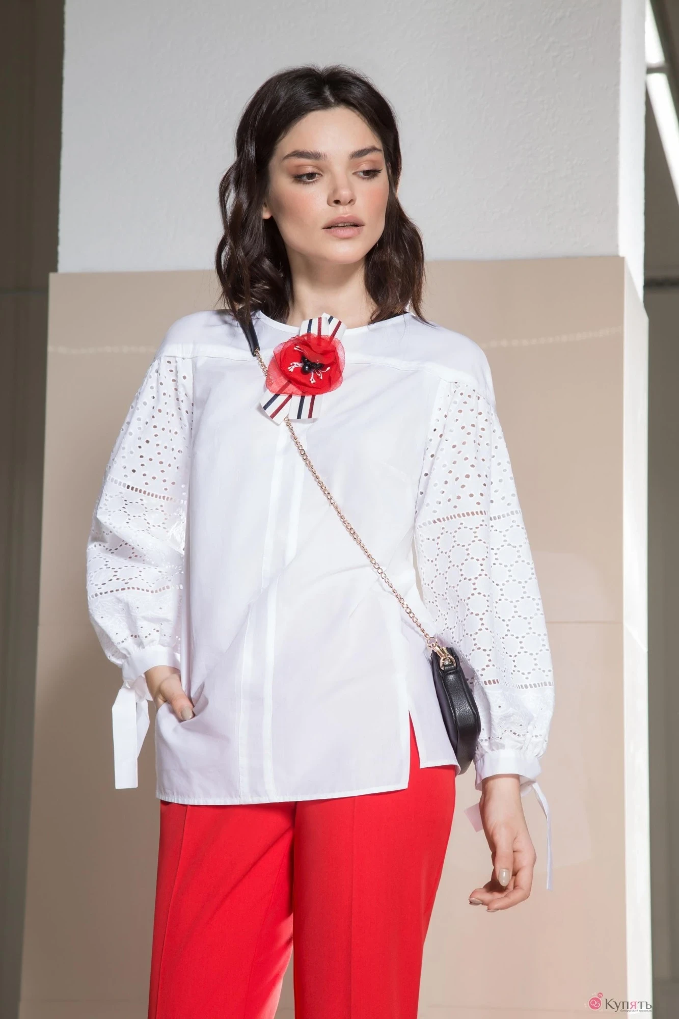 Комплект, состоящий из блузы и брюк. Блуза свободного кроя прямого силуэта с округлым вырезом горловины. По переду центральная планка, нагрудные вытачки и рельефы, переходящие в разрезы. Рукава из отделочной ткани «Ришелье» длиной ¾ с притачной манжетой, переходящей в завязку. Верхняя и нижняя часть рукава со сборкой. По спинке застежка горловины на навесную петлю и пуговицу в среднем шве кокетки. Брюки заужены книзу, на обтачке. По передним половинкам брюк функциональные карманы в боковых швах, застежка на молнию и петлю-пуговицу. Низ брюк фигурный, передняя половинка брюк укорочена на 2.5 см. Съемная брошь ручной работы в комплекте.