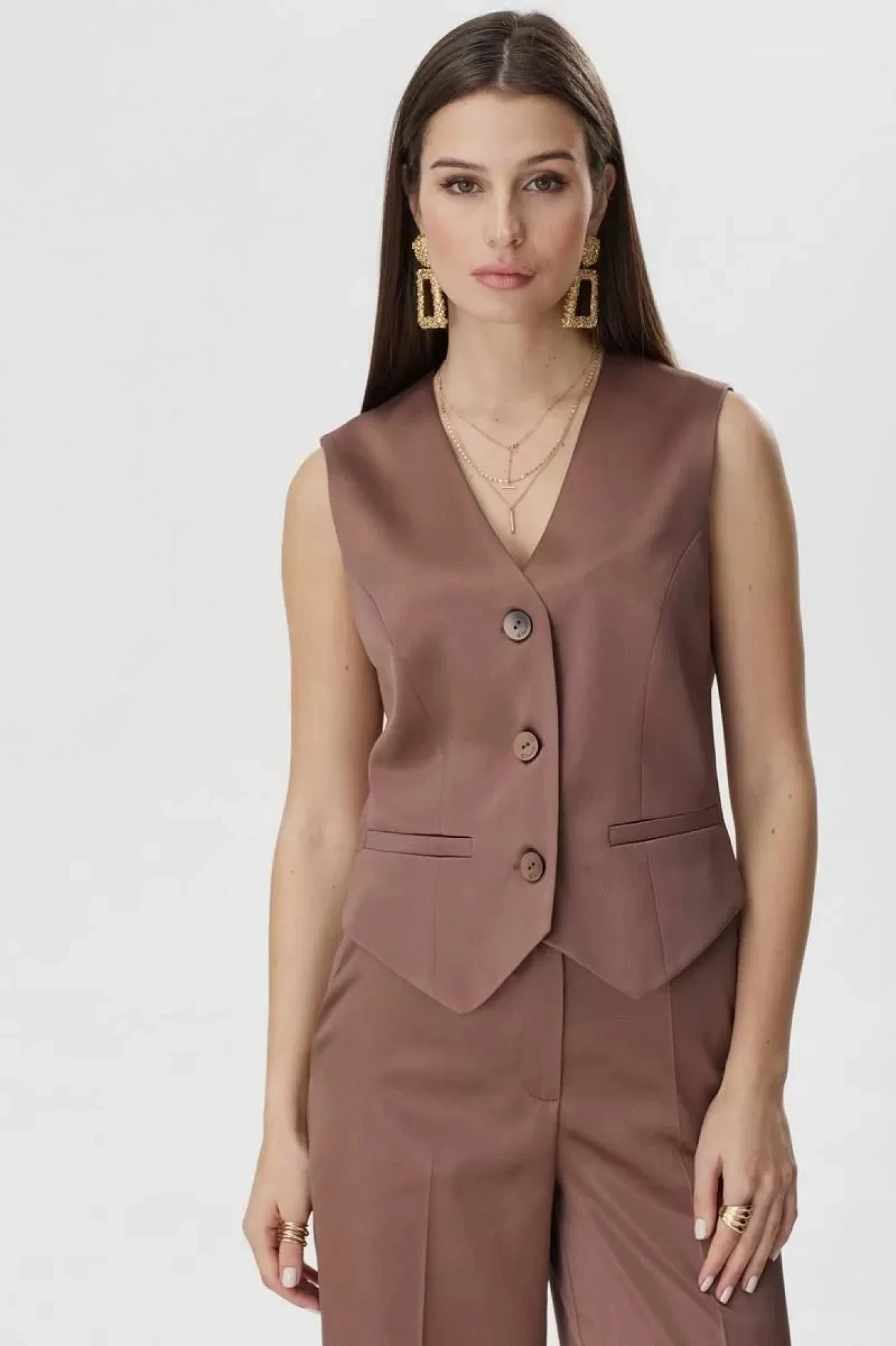 Стильный нарядный комплект, состоящий из жилета и брюк. Жилет полуприлегающего силуэта из костюмной ткани с фигурным низом. Жилет однобортный с центральной застежкой на петли и пуговицы. По переду и спинке рельефы. По переду декоративные листочки. Стильные широкие от бедра брюки прямого силуэта с высокой талией. По верху брюк притачной пояс с застежкой на петлю и пуговицу и шлевками для ремня. На передних половинках обработаны наклонные карманы и застежка молния в среднем шве. Задние и передние половинки с кантом, На задних половинках вытачки. С 48-60р в брюки на поясе вставлена эластичная тесьма (резинка). Обращаем ваше внимание, что фурнитура может незначительно отличаться от фото. !Пояс не входит в комплект !