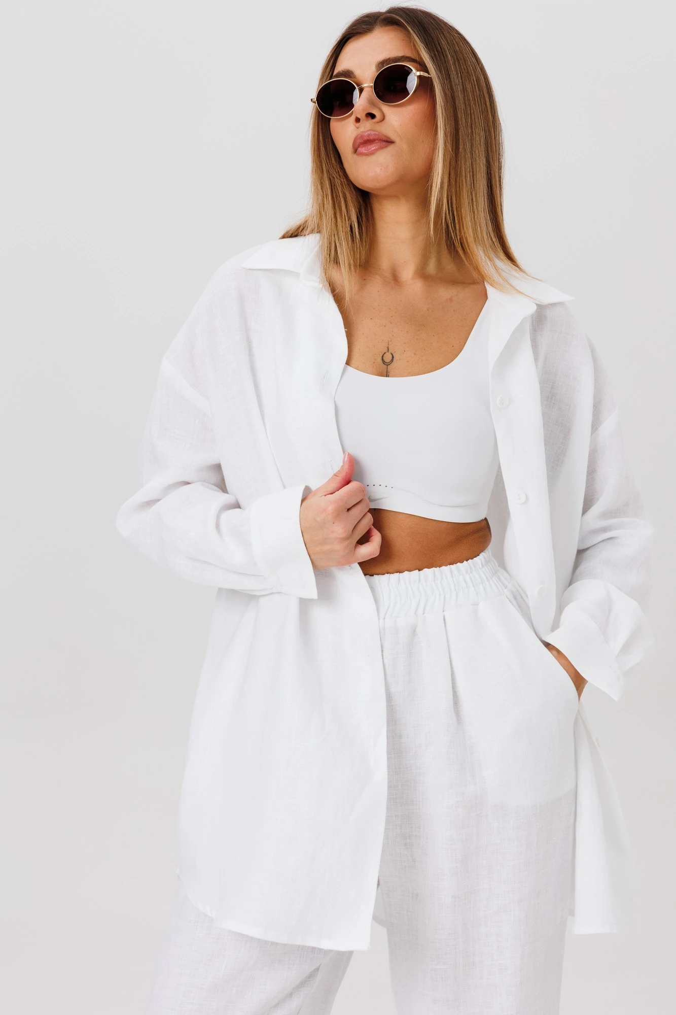 Стильный льняной oversize-костюм Ma Cherie в свободном стиле, состоящий из рубашки и брюк.