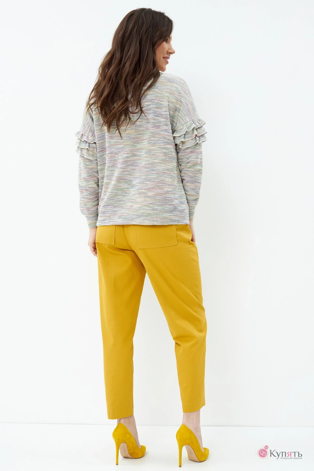 Стильный комплекттиз блузы и брюк. Блуза свободного кроя со спущенным рукавом. Рукав дополнен декоративными рюшами. По груди термо-аппликация . Блуза выполнена из трикотажного полотна. Брюки свободного кроя, слегка заужены к низу, с притачным поясом. Пояс дополнен эластичной тесьмой . Посадка средняя. Брюки дополнены боковыми карманами. По спинке карманы накладные. Застежка на пуговицу и молнию. Длина блузы от плечевого шва 64см. Длина рукава 59см. Длина брюк 98см.