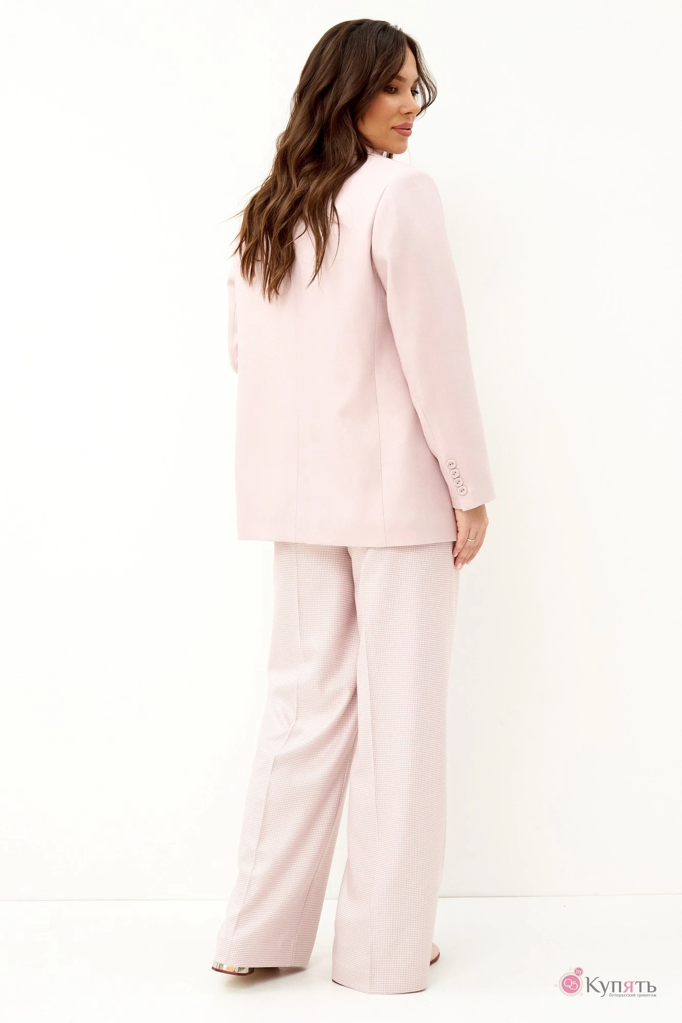 Элегантный комплект из удлиненного жакета, жилета и брюк. Жакет свободного кроя, на подкладке, с центральной застежкой на пришивную пуговицу. Дополнен боковыми прорезными карманами с клапанами. Рукав втачной. Двубортный жилет приталенного силуэта,на подкладке, с отложным воротником, с центральногй застежкой на пришивные пуговицы. Пояс в комплекте. Широкие брюки прямого кроя с притачным поясом, с застежкой на пришивную пуговицу и молнию. Посадка слегка завышена. Дополнены функциональными боковыми карманами. Длина жакета от плечевого шва 70см. Дина рукава 60см. Длина жилета от плечевого шва 57см. Длина брюк 109см.