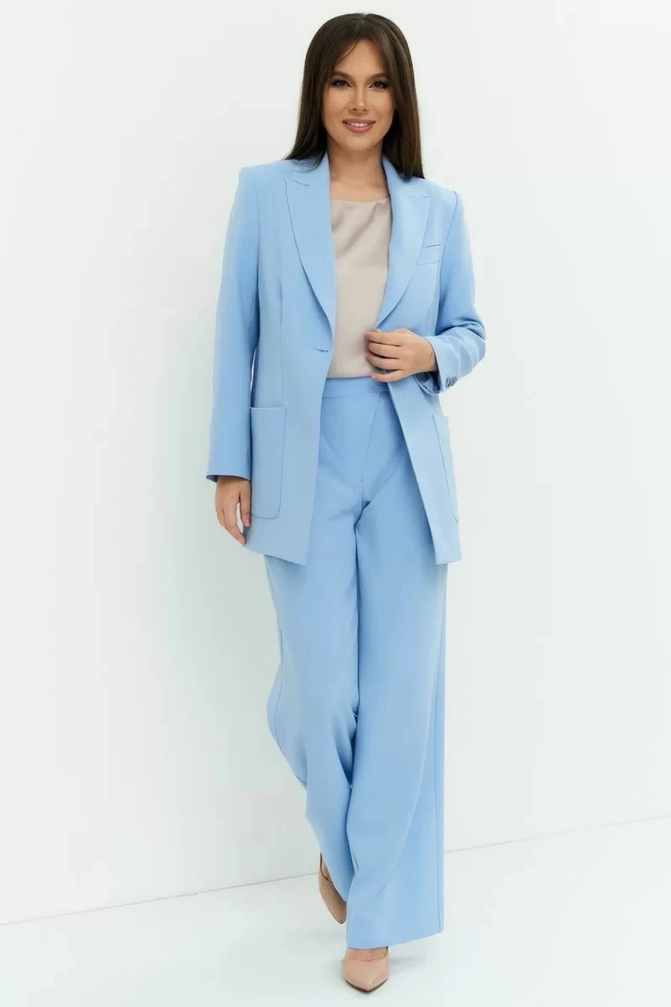 Стильный комплект из жакета, блузы и брюк. Удлиненный жакет прямого кроя, на подкладке с центральной застежкой на пришивную пуговицу. Выполнен из костюмной ткани. Дополнен боковыми накладными карманами. Рукав встачной. Блуза прямого кроя, выполнена из шифона. Широкие брюки прямого кроя с притачным поясом, с застежкой на пришивную пуговицу и молнию. Посадка слегка завышена. Дополнены функциональными боковыми карманами.