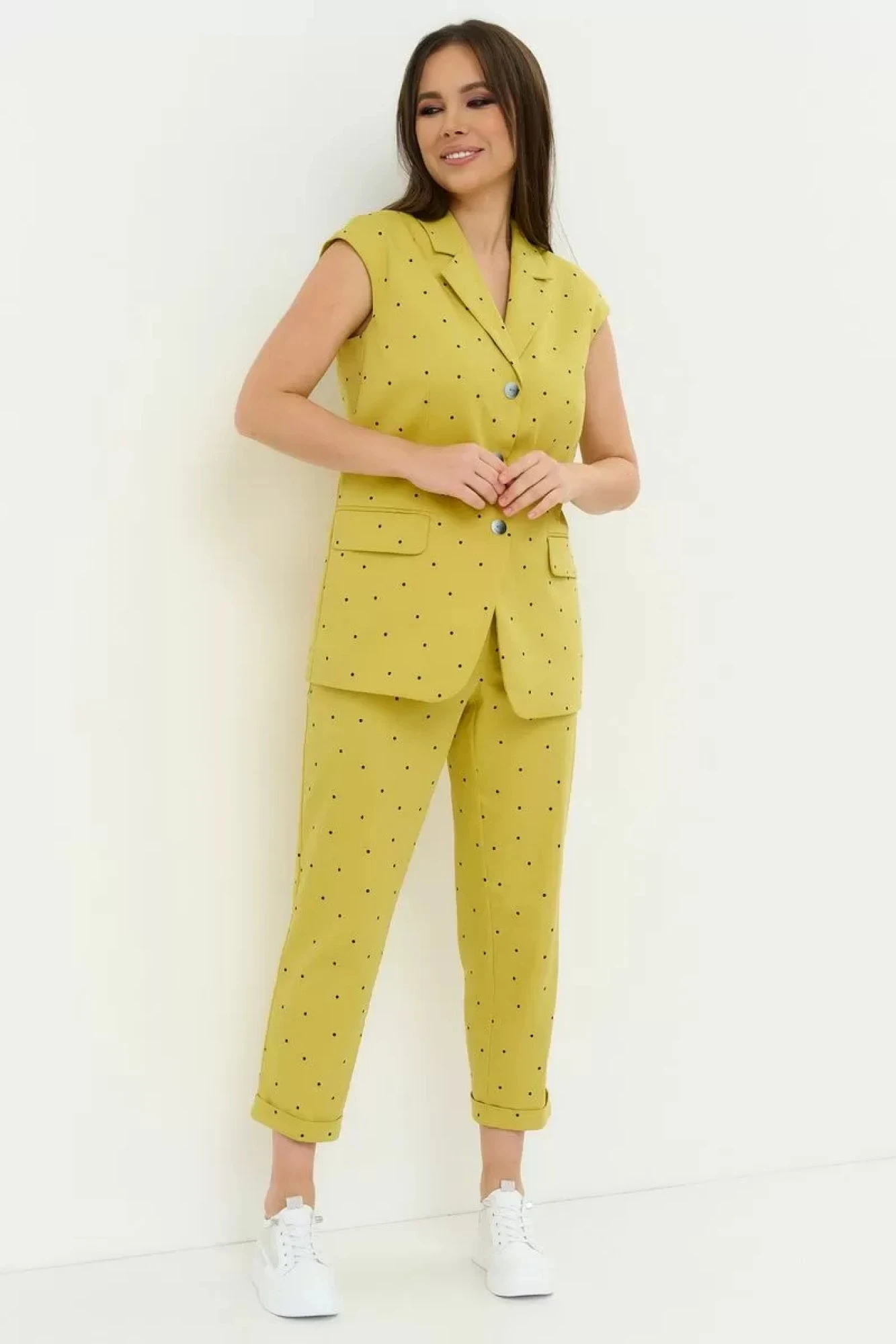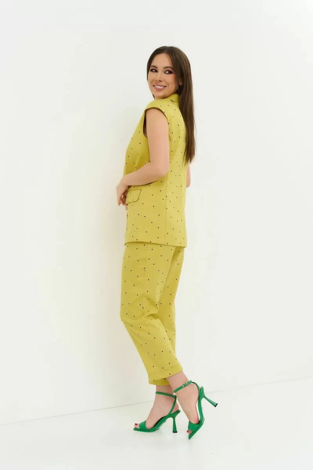 Элегантный хлопковый комплект, состоящий из удлиненного жилета и брюк. Жилет полуприлегающего силуэта с центральной застежкой на пришивные пуговицы. Дополнен боковыми функциональными карманами с клапанами. Брюки прямого кроя, слегка заужены книзу, с притачным поясом, дополненным эластичной тесьмой. Застежка на молнию и пришивную пуговицу. Дополнены боковыми карманами.
