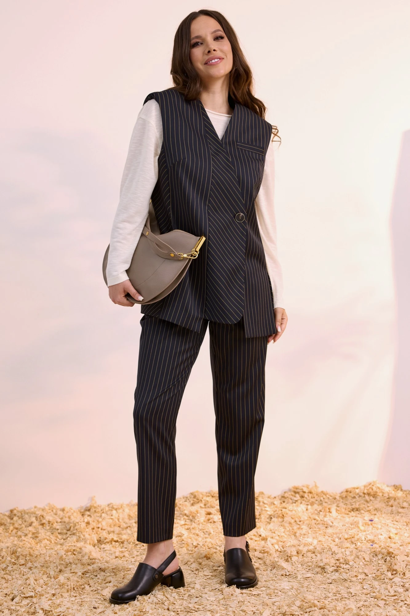 Стильный комплект из удлиненного жилета, лонгслива и брюк. Жилет свободного прямого кроя, на подкладке, с центральной застежкой на пришивную пуговицу. Трикотажный лонгслив свободного прямого кроя со спущенной линией плеча. Брюки классического кроя, слегка заужены книзу. Посадка средняя. Пояс притачной, дополнен эластичной тесьмой. Брюки дополнены удобными боковыми карманами. Застежка гульфик на молнию и металлическую пуговицу. Длина жилета от плечевого шва 76см. Длина лонгслива от плечевого шва 62см. Длина рукава 60см. Длина брюк по боковому шву 95см.