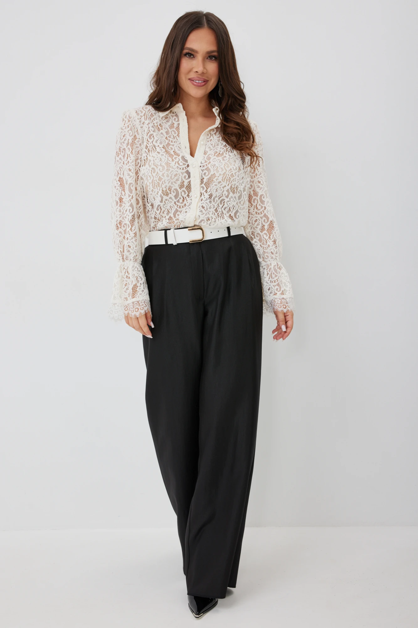 Стильный готовый образ с невероятным сочетанием кружевной блузы в нежном карамельном оттенке с шикарными брюками в красивом молочном цвете. Блуза прямого кроя с нагрудными вытачками. Рукав втачной, по низу присборен на эластичную тесьму и дополнен притачной кружевной манжетой. Застежка центральная на пришивные пуговицы. Воротник отложной на стойке. Блуза выполнена из красивого нежного бархатного кружева премиум качества. Брюки классического прямого кроя. Посадка средняя. Пояс притачной, дополнен эластичной тесьмой. Брюки дополнены удобными боковыми и задними карманами. Застежка гульфик на молнию и пуговицу. Выполнены из красивой гладкой костюмной ткани с жемчужным отливом. Красивый пояс в комплекте. Длина блузы от плечевого шва 67см. Длина рукава 69 см. Длина брюк по боковому шву 107 см.