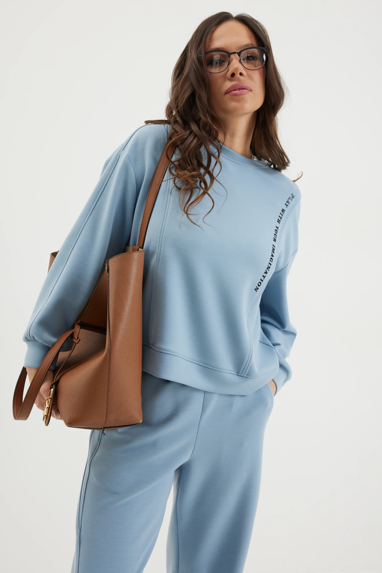 Костюм в минималистичном ключе — идеальное сочетание уюта и современного стиля. Свободный крой свитшота с мягко опущенными плечами и аккуратной отстрочкой выглядит легко и молодо, а ровный подол придаёт образу структурированность. Широкие брюки на резинке по талии и с продольными швами, вытягивают силуэт и дарят полную свободу движений, оставаясь при этом элегантными. Выполнены из мягкого на ощупь трикотажного полотна— словно объятие в прохладный день. Брюки дополнены удобными карманами. Длина свитшота от плечевого шва 60см. Длина рукава 60см. Длина брюк по боковому шву 98см.