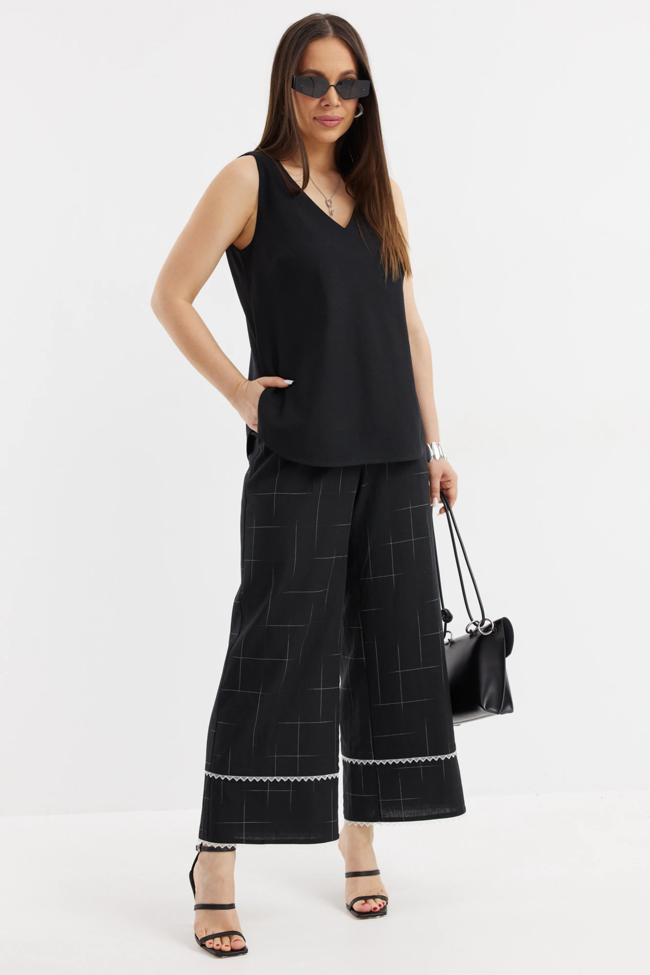 Стильный и комфортный комплект из кружевного кардигана, топа и брюк из смесовой ткани с добавлением натурального льна. Кардиган свободного кроя на так популярных в этом сезоне завязках. Рукав свободный, слегка спущен. Дополнен красивой отделкой кружевной тесьмой. Топ прямого кроя, без рукава с V-образной горловиной. Слегка укороченные брюки классического прямого кроя с красивой отделкой кружевной тесьмой. Дополнены притачным поясом с эластичной тесьмой и удобными боковыми карманами. Длина кардигана от плечевого шва 77см. Длина рукава 60см. Длина топа от плечевого шва 66см. Длина брюк по боковому шву 99см.