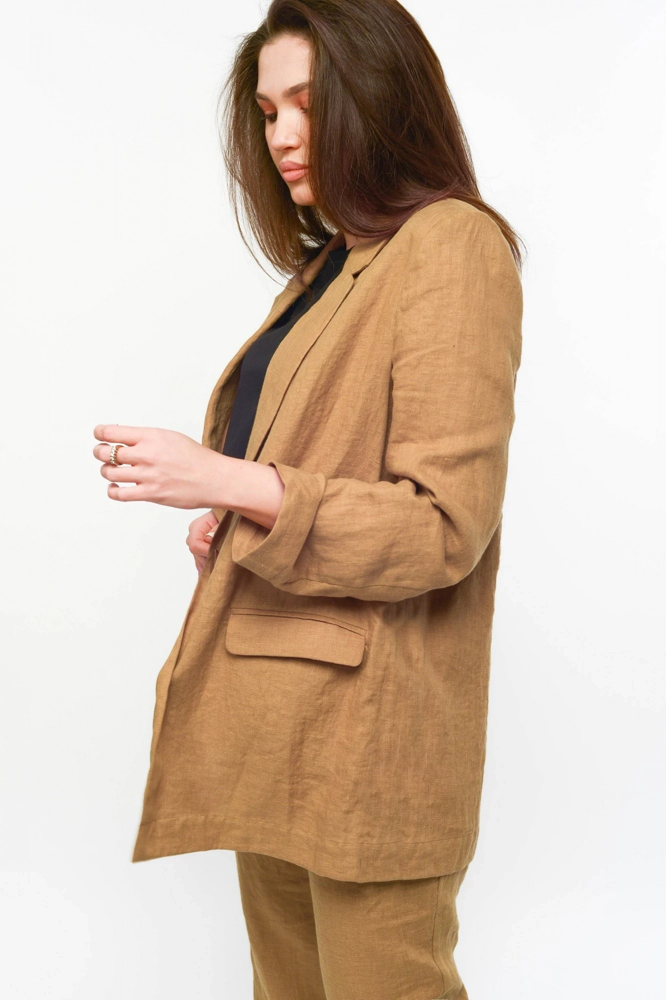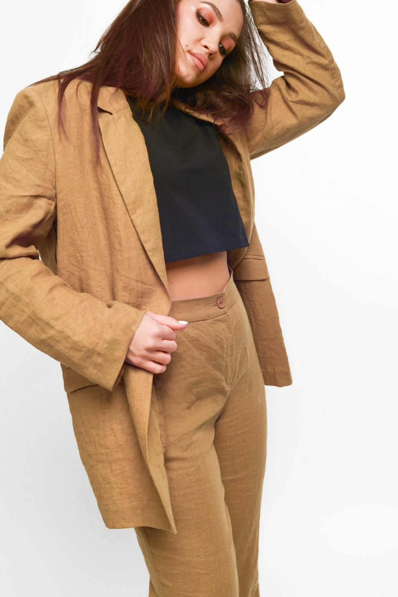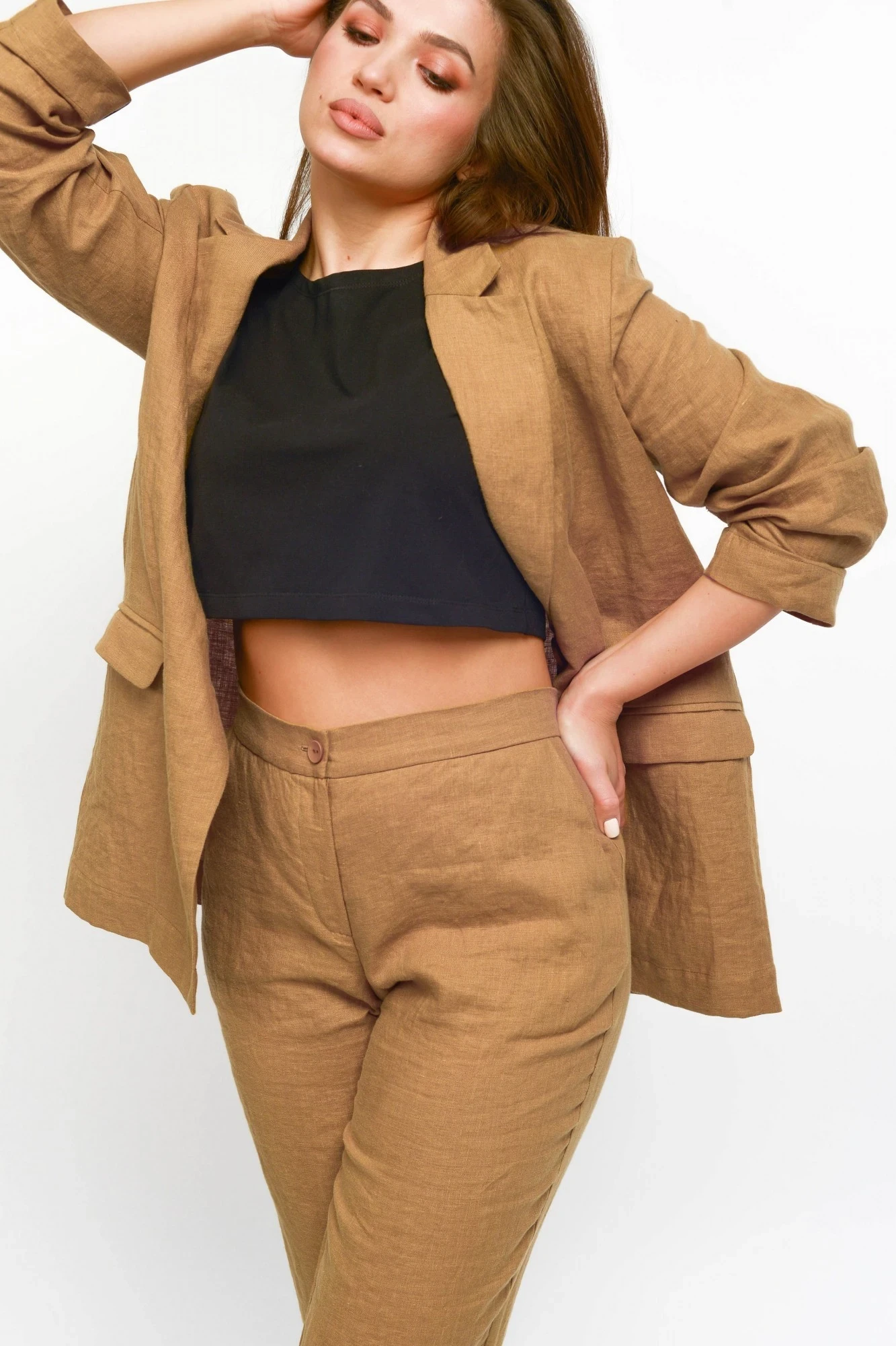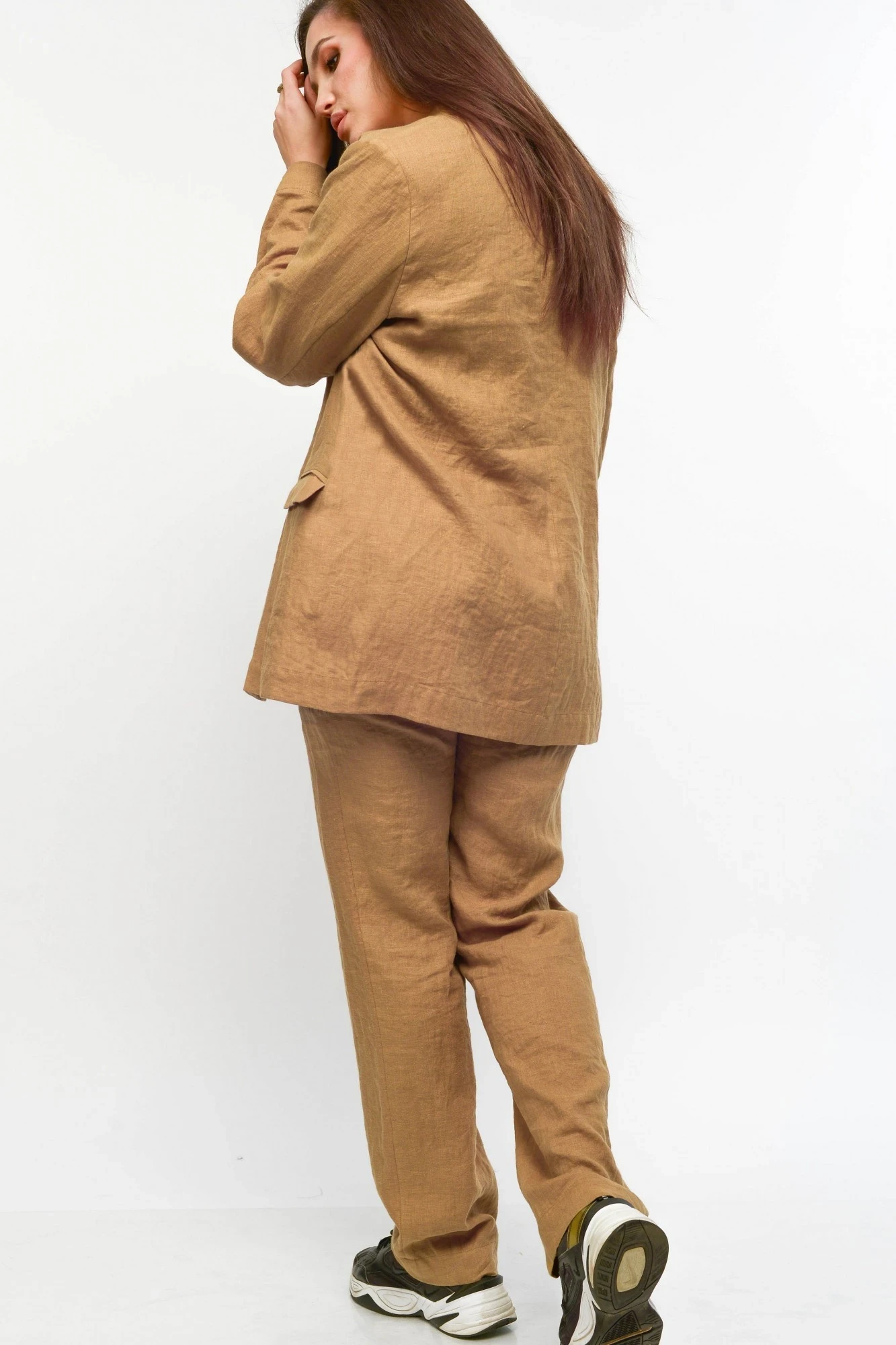 Костюм, состоящий из жакета и брюк. Жакет прямого силуэта без подкладки, на застежке на петлю и пуговицу. Перед без вытачек с карманами "в рамку" с клапанами. Спинка со средним швом. Воротник стояче-отложной на отрезной стойке с лацканами. Рукав втачной двухшовный, длинный. Брюки прямые на прямом поясе, застежка на петлю и пуговицу. Перед с наклонными карманами у боковых швов и центральной застежкой-гульфиком на молнию. Задние половинки брюк с талиевыми вытачками, справа имитация прорезного кармана с листочкой.
