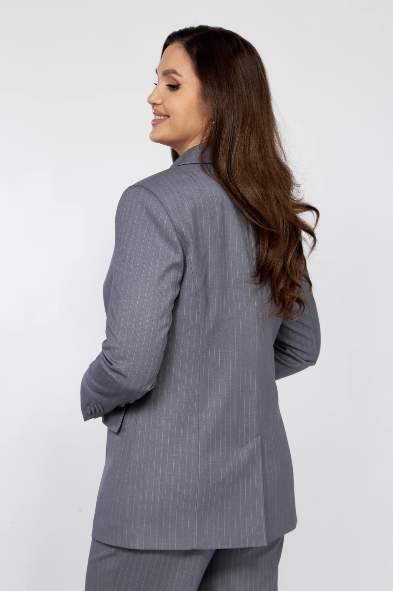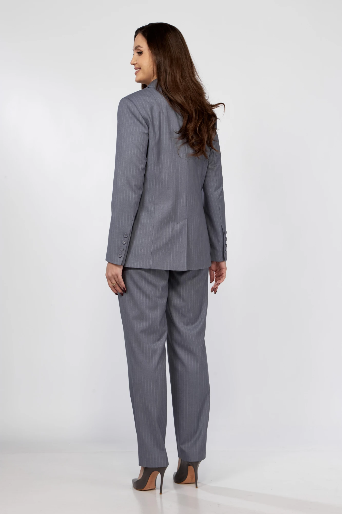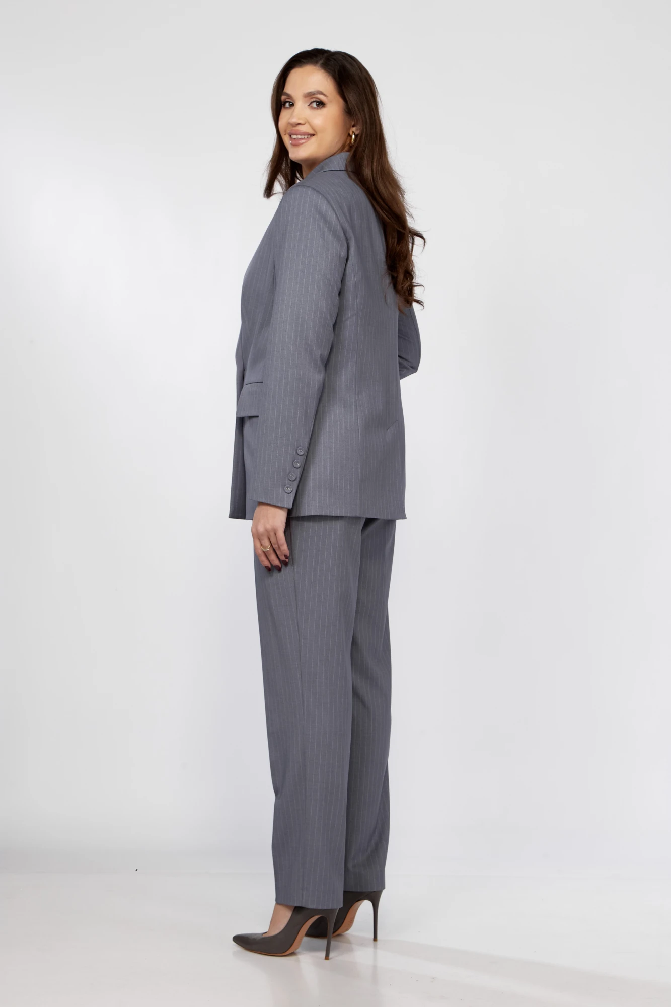 Комплект, состоящий из жакета, жилета и брюк. Жилет полуприлегающего силуэта на полной подкладке и застежкой на пуговицы. По переду прорезной карман, сзади - хлястик с застежкой на 2 пуговицы. Брюки свободного силуэта с косыми карманами. Пояс брюк прямой. Застежка на пуговицы и молнию. Жакет женский полуприлегающего силуэта на двубортной застёжке на четыре пуговицы. По спине средний шов со шлицей. Карманы прорезные с клапанами и двумя обтачками. Рукав двухшовный со шлицей и декоративными пуговицами.