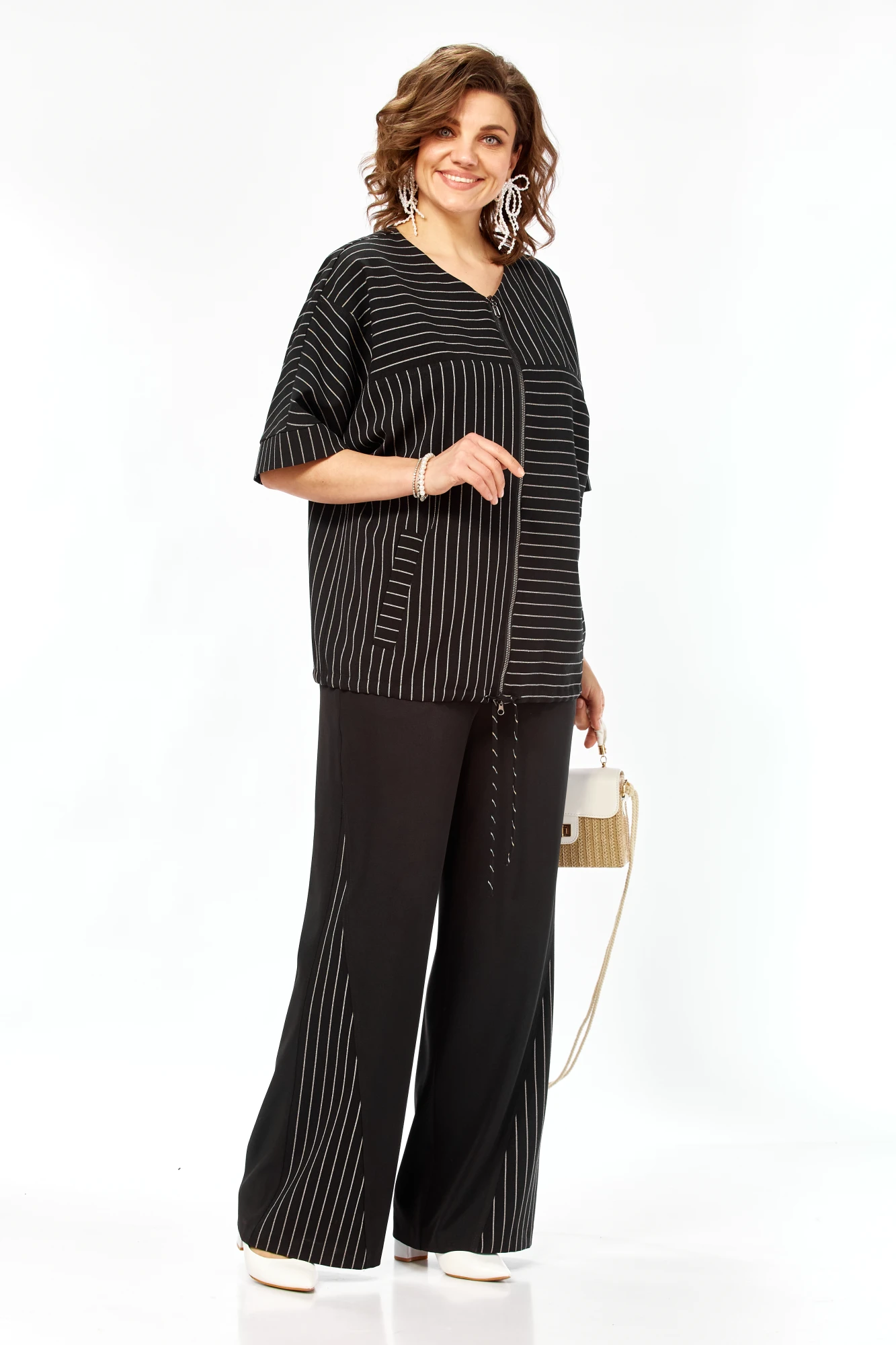 Комплект женский 2-х предм., состоящий из брюк и жакета. Жакет женский с центральной молнией по переду, V-образным вырезом горловины, отрезными кокетками по переду, прорезными карманами с листочкой и цельнокроеным рукавом на отрезной манжете, длина рукава до локтя. По низу жакета имеется кулиса. Брюки свободного кроя, на круговой резинке, с карманами в боковых швах. По переду выполнена клиновидная вставка из полосатой ткани.