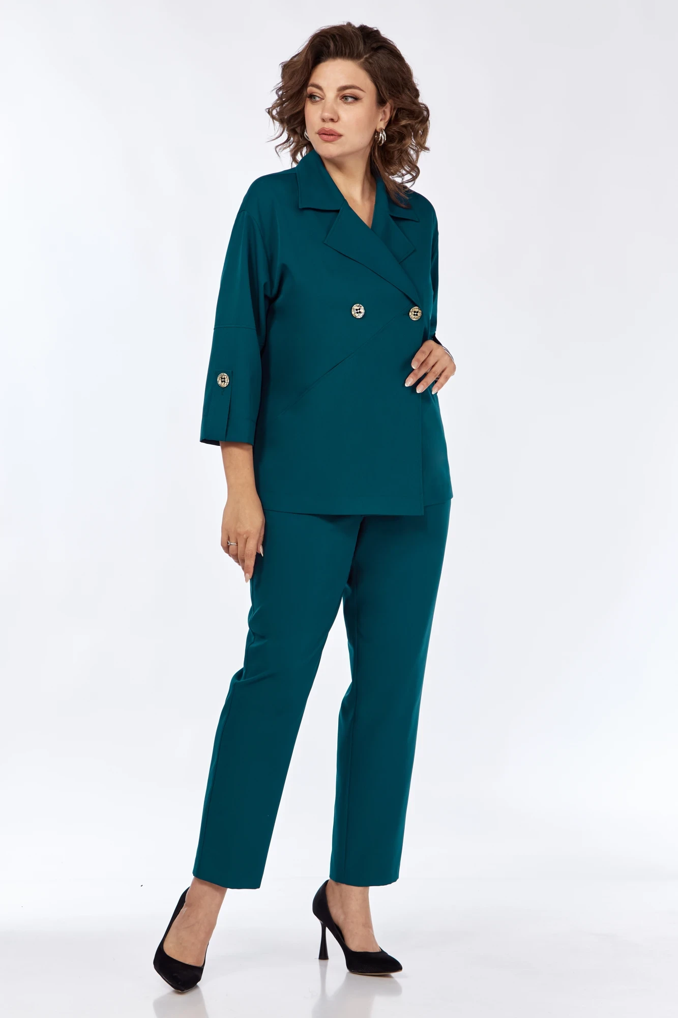 Комплект женский 2-х предметный, состоящий из жакета и брюк. Жакет без подкладки, с двубортной застежкой, воротником пиджачного типа. Перед с диагональными подрезами от боковых швов до подборта, в подрезах имеются функциональные карманы. Спинка со средним швом. Рукав втачной, одношовный на спущенной линии плеча. Длина рукава 3/4, с отрезной широкой манжетой, присобирается на пату с застежкой на петлю-пуговицу. Брюки полной длины, слегка заужены к низу, со складками от отрезного пояса по переду, карманами-хулиганами в боковых швах. По спинке, в пояс брюк вставлена резинка.