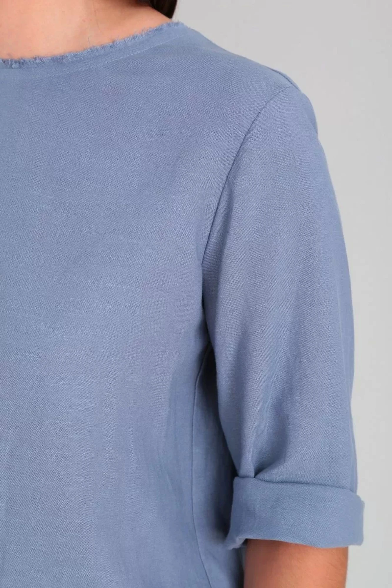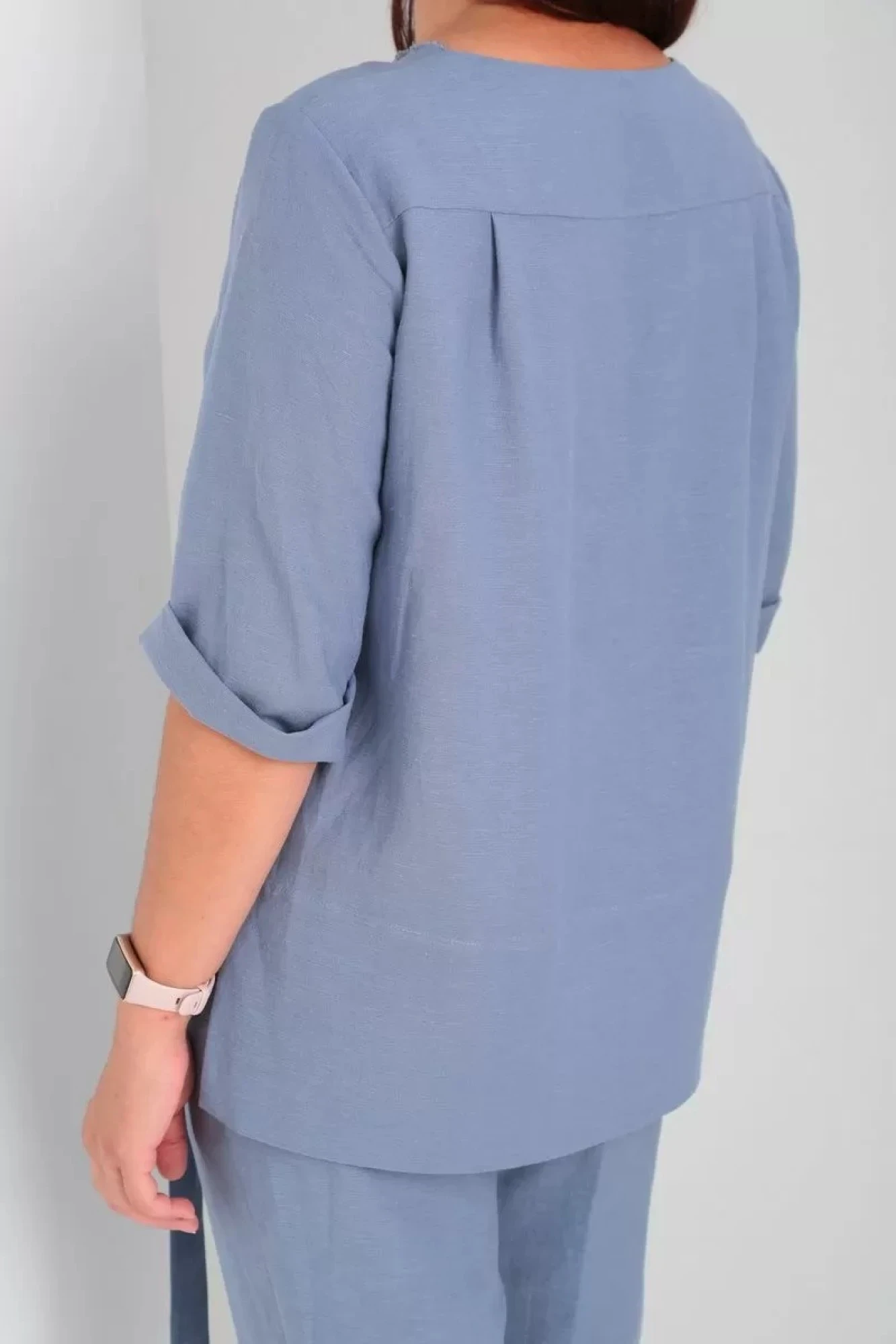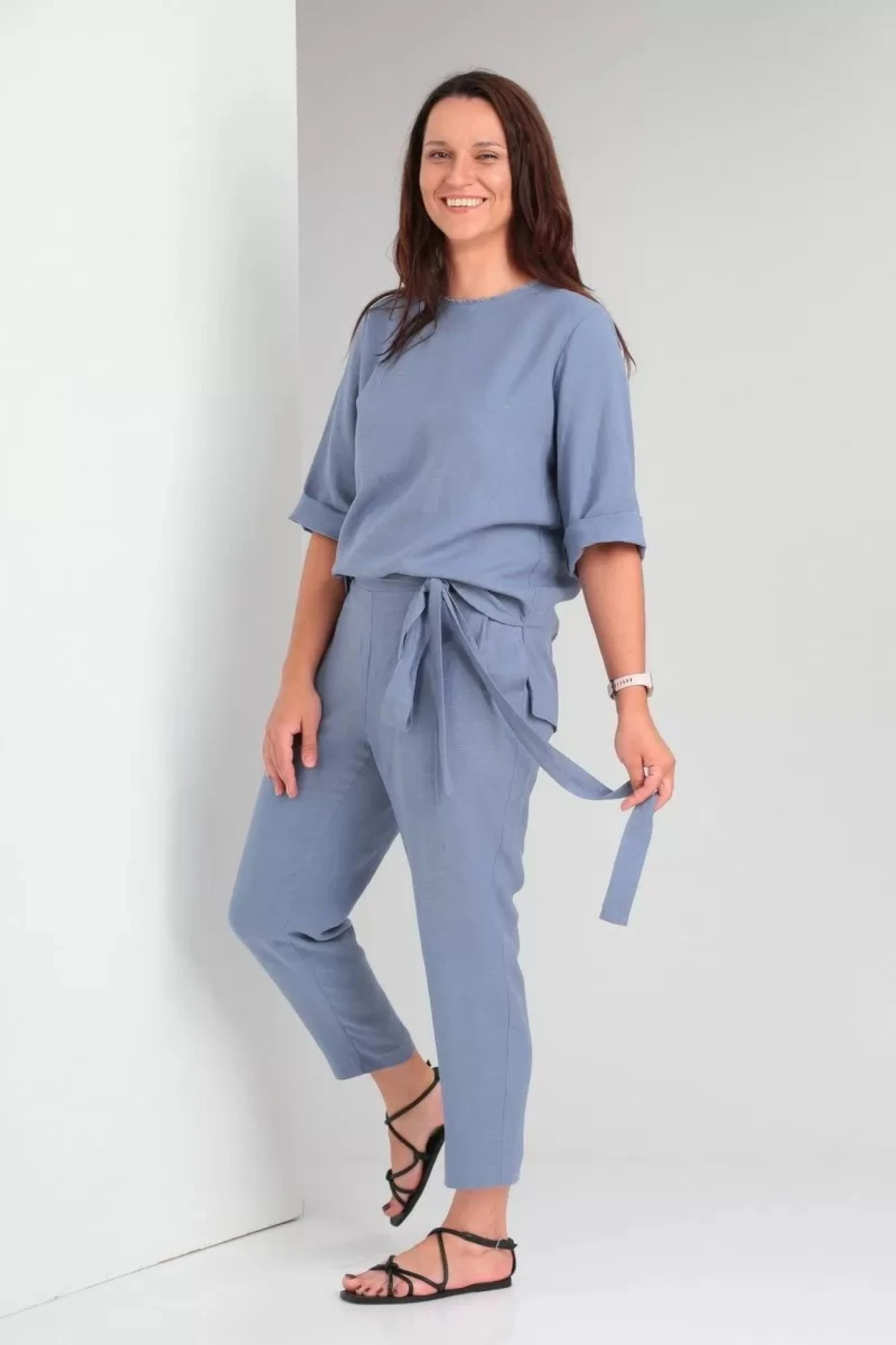 Блузка рубашечного силуэта без застежки. Рукав прямой 3/4. Полочка и спинка разной длины с боковыми разрезами. Низ полочки закругленной формы. Длина по центру спинки 68 см , длина рукава 43 см.. Брюки зауженные без застежки с боковыми карманами. Пояс регулируется по ширине резинкой и завязывающимся поясом. Длина брюк по боковому шву от пояса 91см..