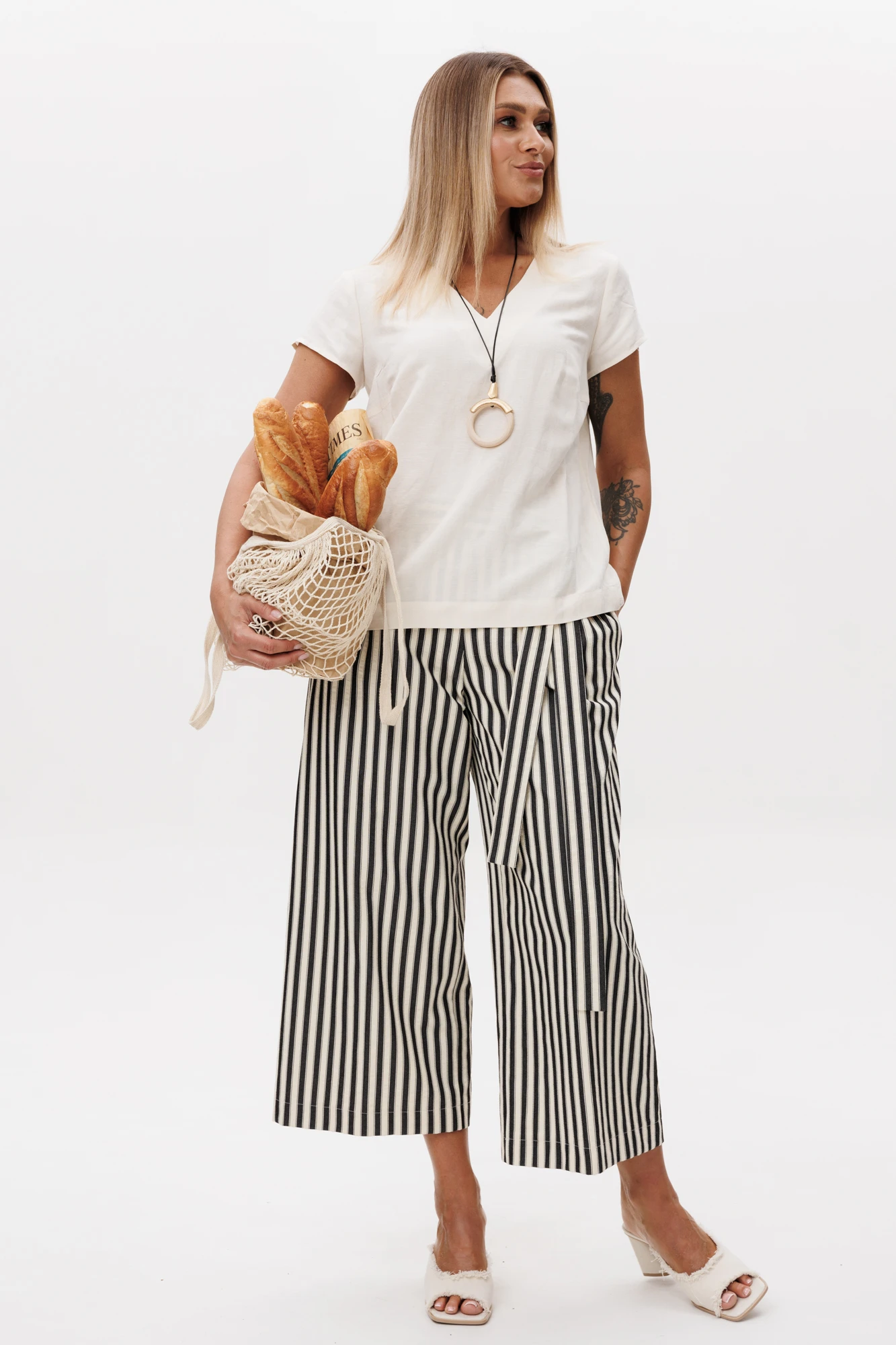 Комплект двухпредметный, состоит из блузы и кюлотов. Блуза свободного кроя с коротки рукавом и запахом на спите. Кюлоты прямые из вискозной ткани . В боковых швах карманы, пояс по спинке регулируется резинкой. Кюлоты без застежки.