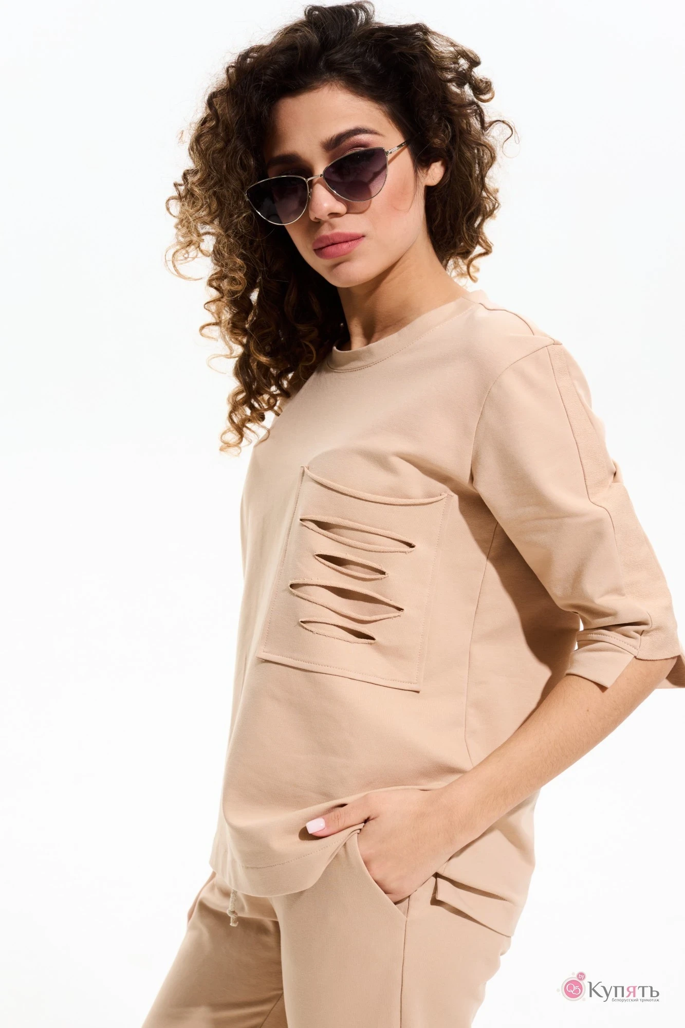 Костюм из трикотажной ткани. Джемпер прямого силуэта со спущенным плечом и втачным рукавом. Рукав с декоративными подрезами по центру и притачной манжетой по низу. Горловина на планке. Низ на широкой подгибке с разрезами по боковым швам. Спереди декоративный нагрудный карман.