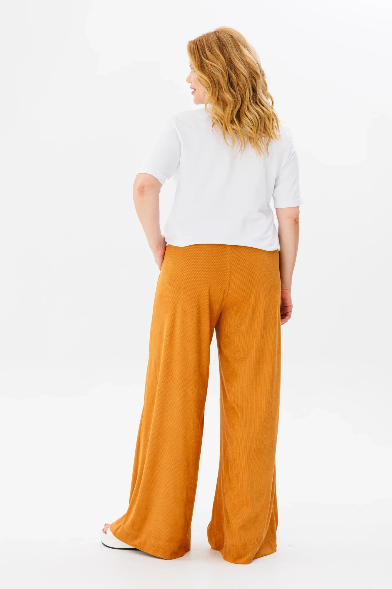Универсальный и удобный женский брючный костюм для повседневной носки. Футболка свободного кроя, выполнена из мягкой приятной на ощупь хлопковой ткани. Округлая контрастная горловина, рукав укороченный. По переду изделие украшено нашивкой. Брюки-палаццо идеально сидят на любой фигуре, подчеркивая все достоинства и скрывая недостатки. Брюки выполнены из прятной хлопковой ткани (штрукс). Изделие свободного кроя, длинные, на притачном поясе с резинкой. По переду два кармана в боковых швах. Оба изделия смело можно сочетать с другими вещами Вашего гардероба и любой по стилю обувью