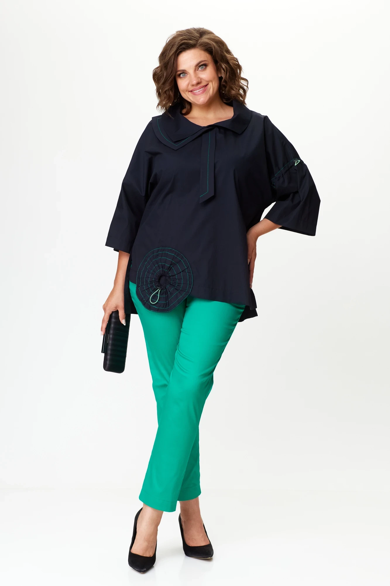 Комплект женский брючный повседневный. Женская хлопковая блуза в стиле «бохо» свободного кроя, вырез горловины круглый с раскладным асимметричным воротником, по спинке скрепленным патой, а по переду с декоративным «галстуком». Рукав втачной 3/4, низ блузы так же с асимметрией и боковыми разрезами. Перед цельный, спинка разрезная с плечевой кокеткой, переходящей в рукав. Левый рукав — с кулиской и декоративной стяжкой. Так же по переду круглый декоративный карман-стяжка. Брюки выполнены из хлопковой ткани средней плотности, длина 7/8, слегка заужены к низу, по верху на притачном поясе с резинкой по бокам. По переду с двумя боковыми карманами в швах и центральной застежкой на молнию и пуговицу. Универсальность кроя и легкая ткань сделают его любимым изделием Вашего гардероба.
