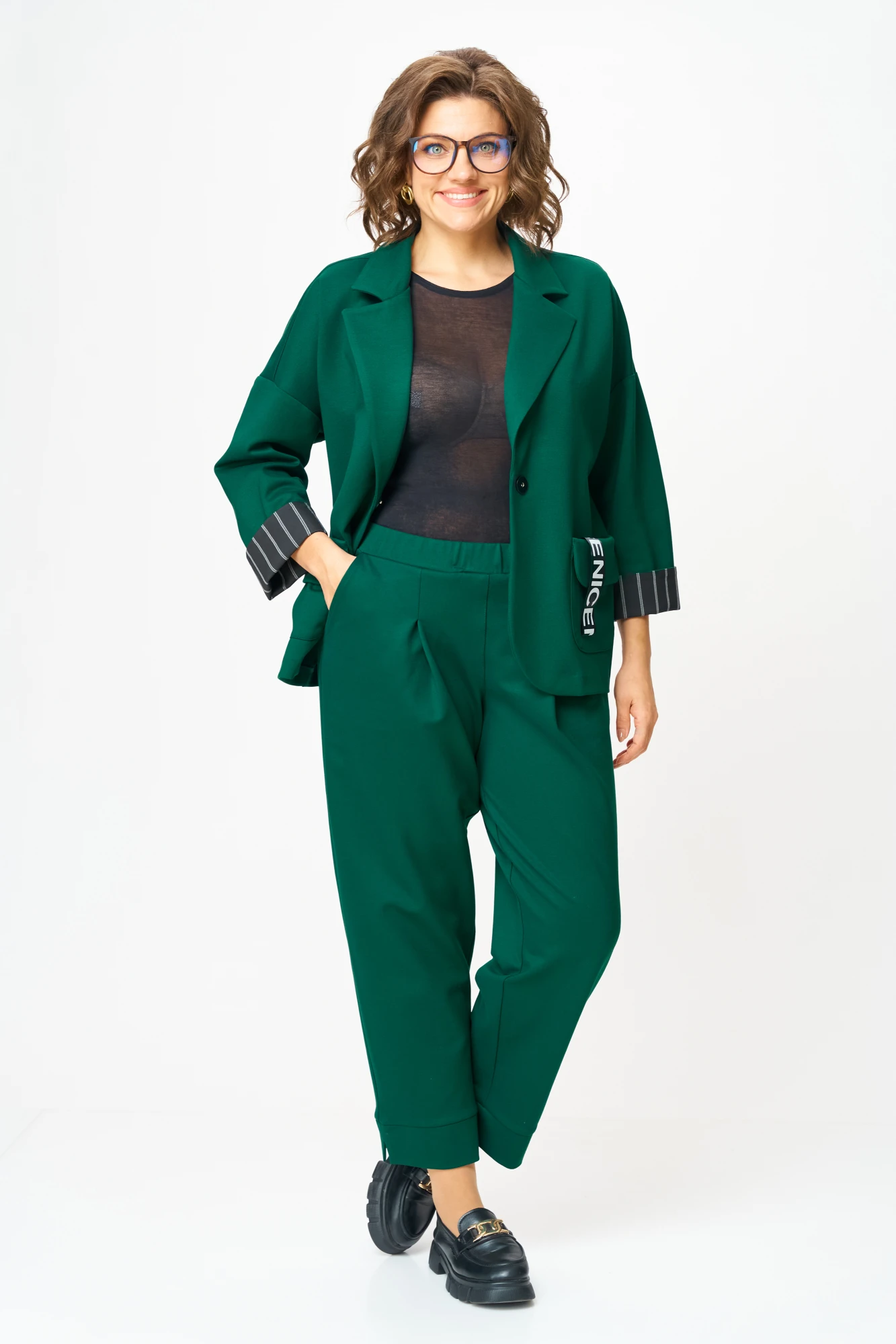 Костюм, который подчеркивает вашу уверенность и женственность. Плотный трикотаж с добавлением нейлона делает его пластичным и износостойким — он держит форму и смотрится дорого в любой ситуации. Богатый изумрудный оттенок словно создан, чтобы добавить выразительности в повседневность, а изящная отделка текстилем и контрастные детали превращают образ в по-настоящему уникальный.