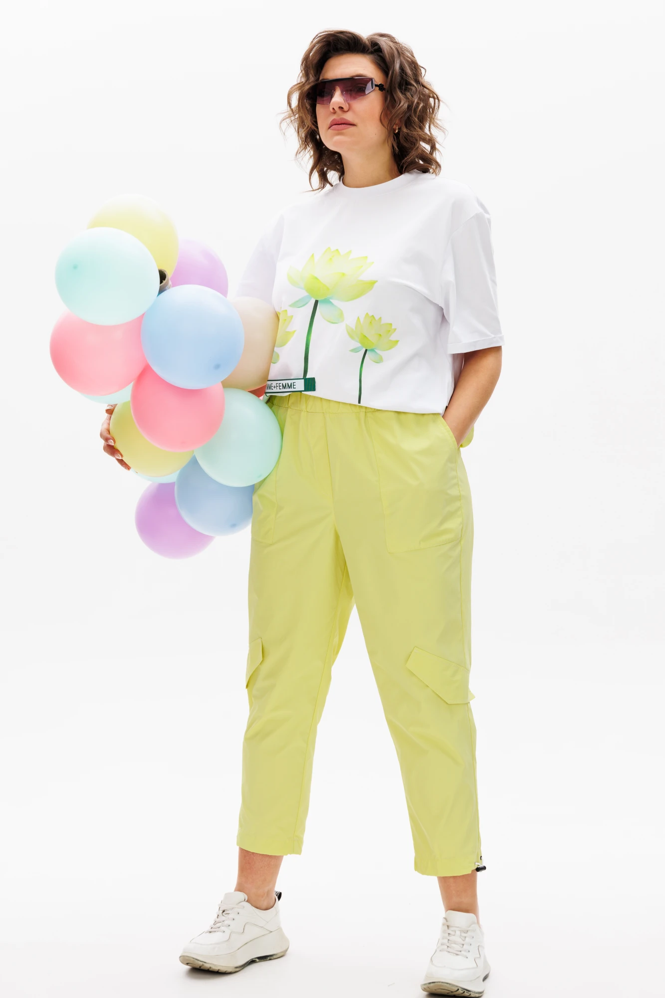 Комплект женский брючный, летний спортивного типа станет для вас незаменимым в весенне-летний период, благодаря своей универсальности и практичности. Футболка прямого, свободного кроя. Перед цельный с декоративной термоаппликацией, спинка с талиевым подрезом из брючного материала, выполняющего роль отделки, по низу подреза кулиса со стяжкой из тонкой резинки с фиксатором в разрезе, рукав втачной, одношовный , короткий с двойной узкой подгибкой — манжетой. Горловина-круглая с трикотажной планкой. Брюки-бананы 7/8 , на поясе с резинкой, по боковым с двумя накладными карманами и двумя клапанами чуть ниже колена. По низу брюки стянуты на тонкую резинку с фиксатором .