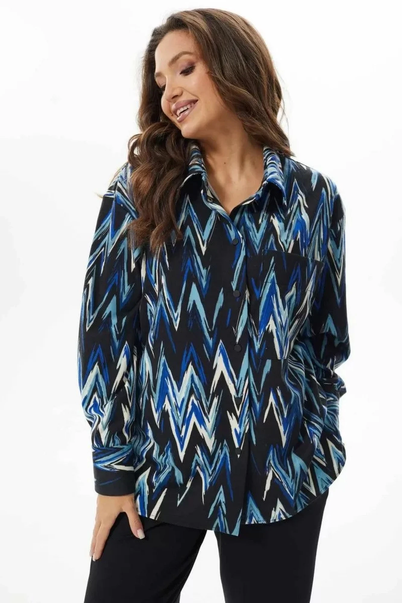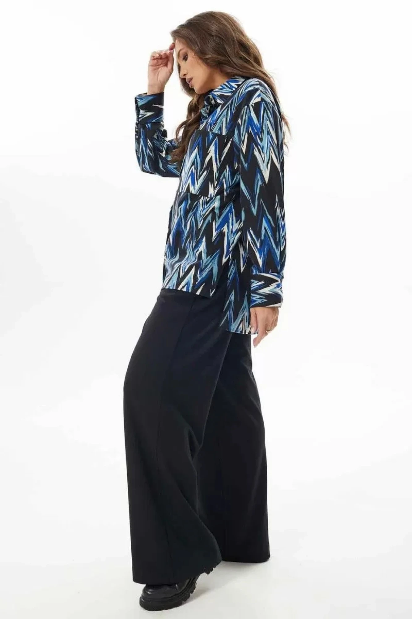 Костюм женский состоит из блузы и брюк свободного силуэта. Блуза рубашечного типа с разноуровневым низом, застежка на пробивные кнопки. По переду накладной карман. Рукав одношовный рубашечного типа с манжетой, застегивающейся на две кнопки. Боковые швы заканчиваются разрезами. Воротник отложной с отрезной стойкой. Брюки прямые, однотонные, длина maxi, в боковых швах карманы. пояс на резинке.
