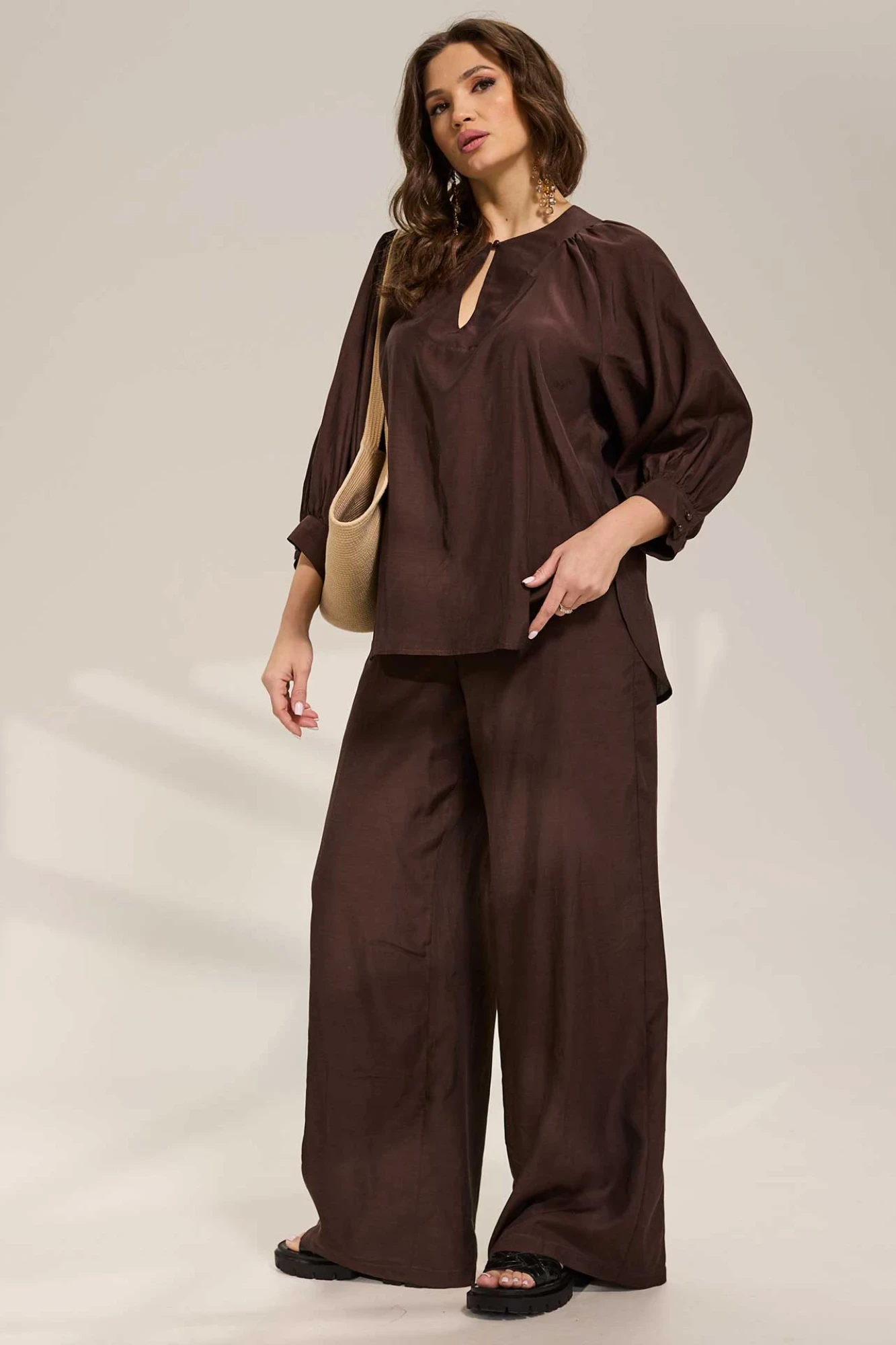 Костюм женский, состоит из блузы и брюк. Блуза прямого силуэта. Рукав - реглан, со сбокой по низу рукава и окату. Низ рукава на притачной манжете с застежкой на наввесную петлю-пуговицу. По переду и спинке блузы - отрезные кокетки.Горловина круглая, застежка по переду на навесную петлю пуговицу. Брюки на резинке, свободные, прямые, с карманами в боковых швах.