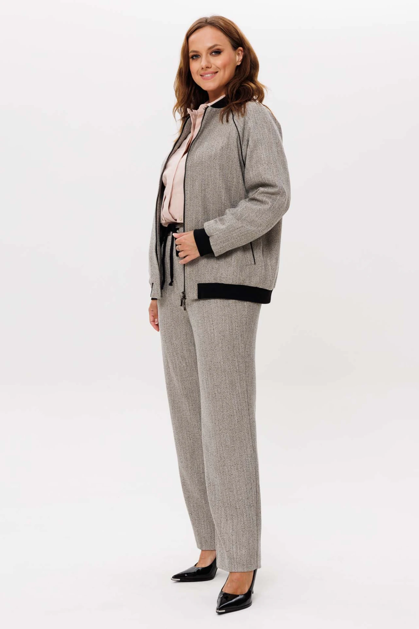 Костюм женский, состоящий из бомбера и брюк. Бомбер свободного силуэта, застежка на центральную тесьму-молнию, по переду обработаны прорезные карманы с кантом. Рукава-реглан. Горловина, рукава и низ изделия обработаны отделочной тканью. Бомбер на подкладке. Брюки слегка заужены к низу, пояс на резинке. Боковые карманы с отделочным кантом.