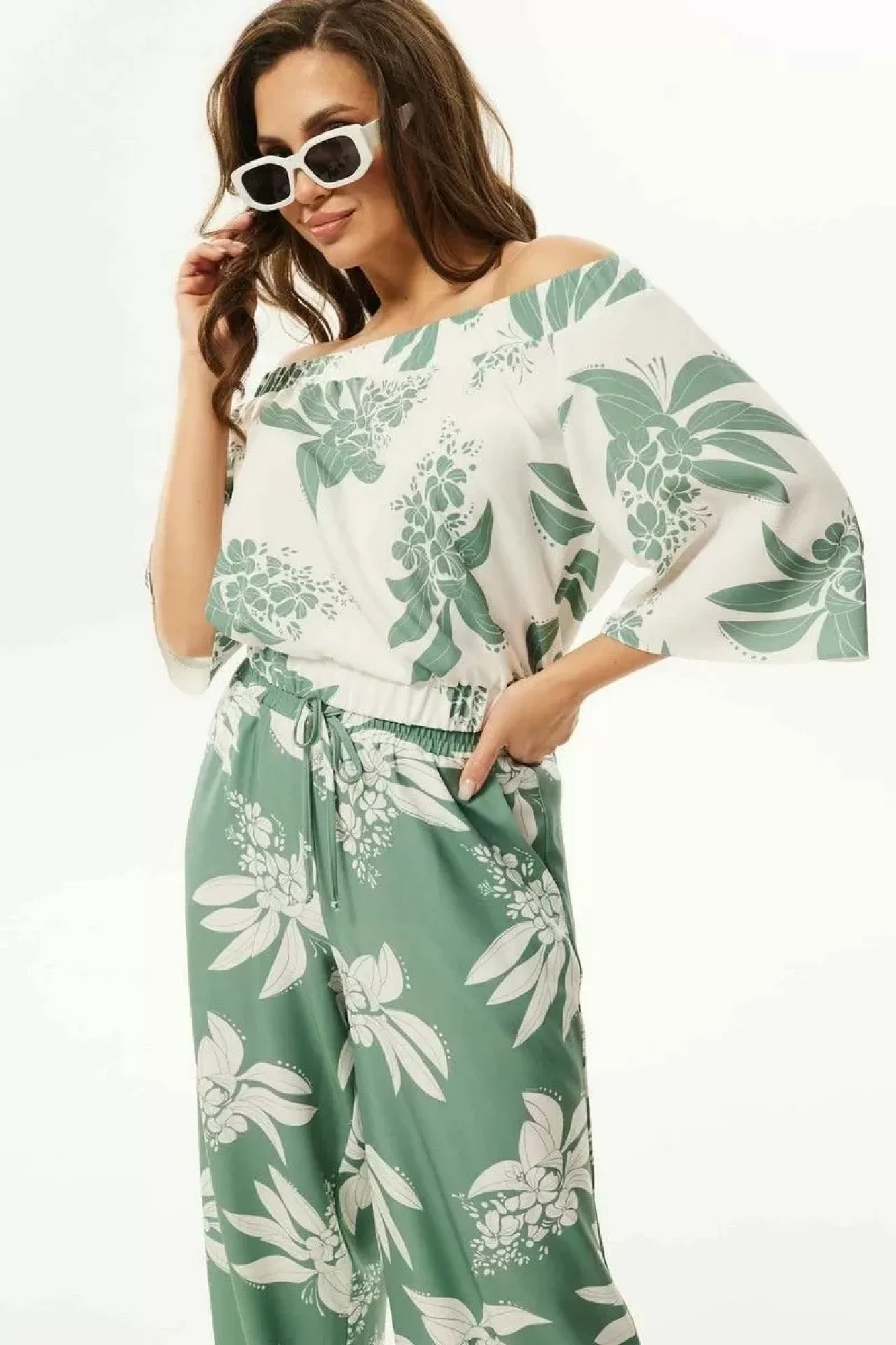 Костюм женский состоит из блузы и брюк. Блуза свободная, по горловине и низу блузы притачная планка на широкой резинке. Рукава одношовные втачные «реглан». Брюки женские свободного силуэта с высокой посадкой, максимальным расширением от бедра (палаццо), на притачном поясе на резинке с боковыми карманами.