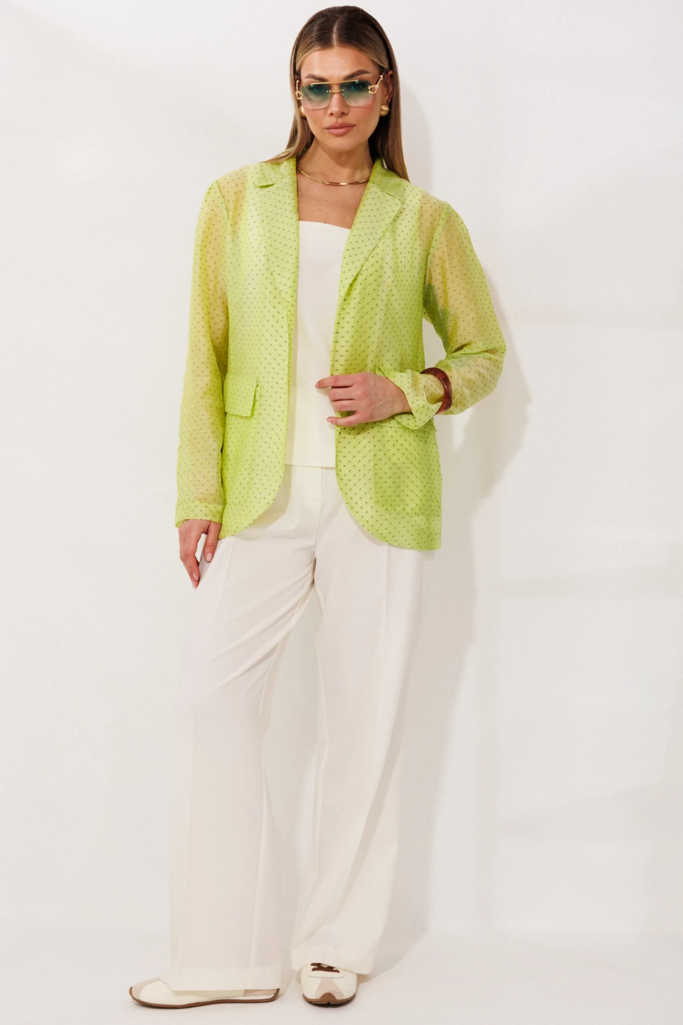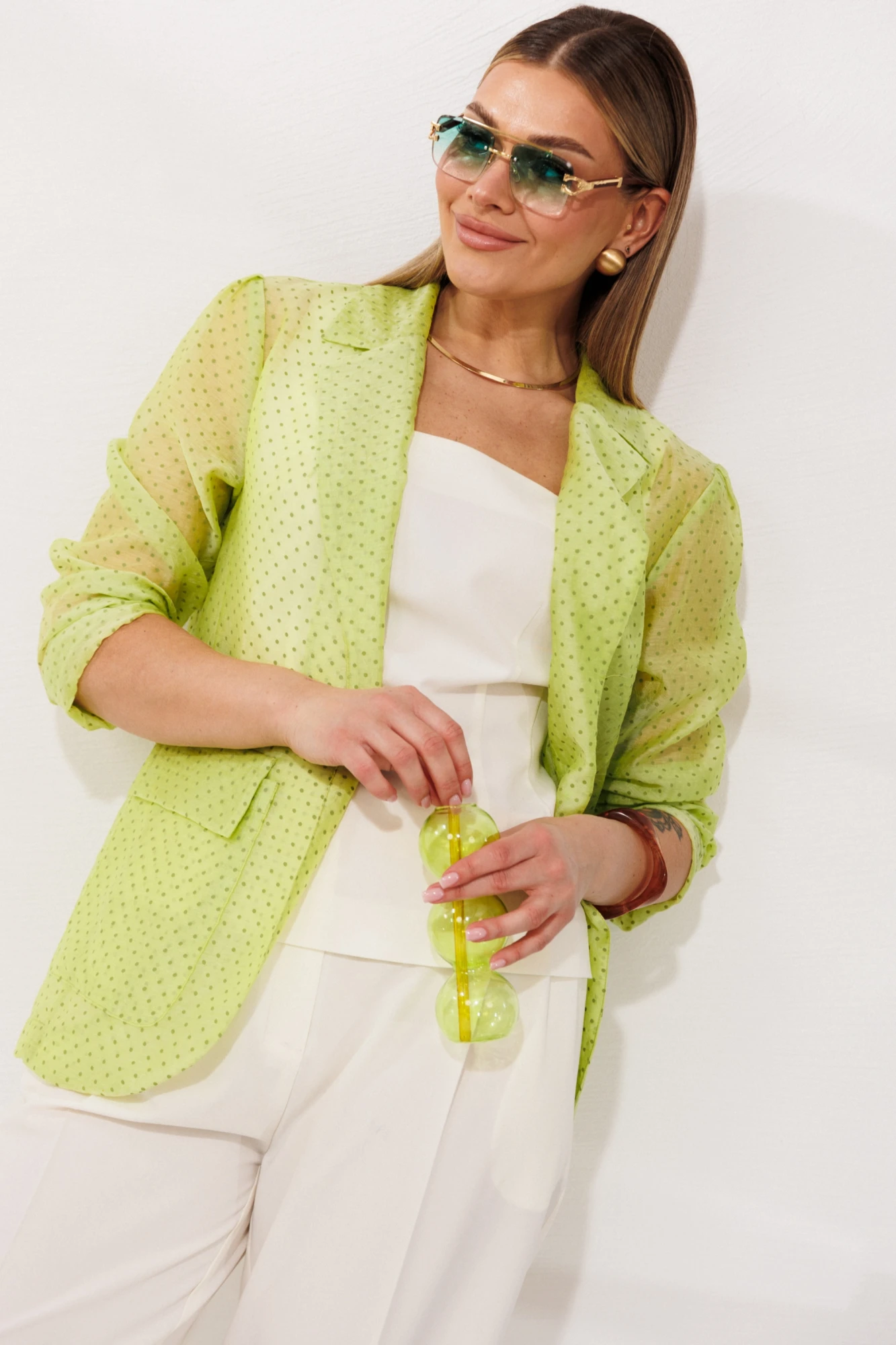 Комплект-тройка, состоящий из жакета, брюк и топа. Жакет выполнен из тонкой, прозрачной вуали свободного кроя без застежки по борту. Воротник английский, рукава по окату с небольшими складками, линия плеча слегка спущена. Рукав можно носить как длинным, так и с небольшим подворотом по низу. По переду накладные карманы и клапаны. По спинке средний шов и небольшие талиевые вытачки. По переду отрезной бочок. Топ из текстильной ткани, с укороченной линией плеча и расширенной горловиной. Горловина спинки и переда углубленные и квадратной формы. Спинка и перед с талиевыми вытачками для придания приталенного силуэта. По спинке застежка на потайную молнию. Брюки прямые, свободного кроя, со складками по передним половинкам. По бокам карманы "хулиганы". Пояс со шлевками и резинкой по задним половинкам брюк. Застежка по переду на молнию и пуговицу.