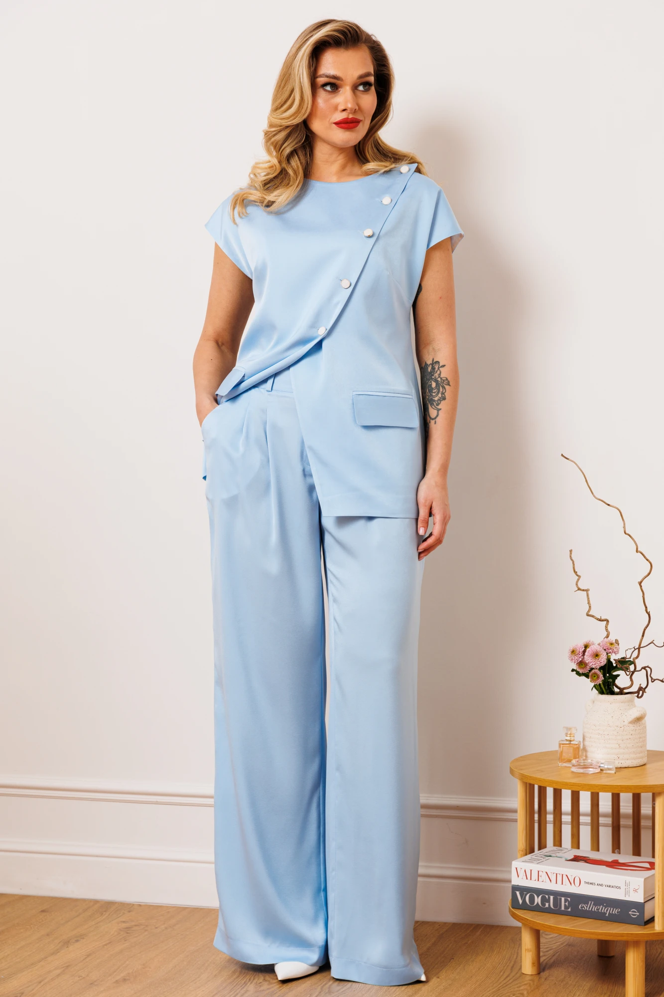 Нарядный образ с брюками из шелковистой струящейся ткани с благородным блеском. Состоит из жилета с ассиметричной застежкой. Полуприлегающий силуэт, спущенное плечо, горловина округлой формы. Карманы с клапанами. Брюки "палаццо" на притачном поясе, с двумя складками в области талии. Застежка в среднем шве. Жилет на хлопковой подкладке. В брюках резинка по талии (сзади).