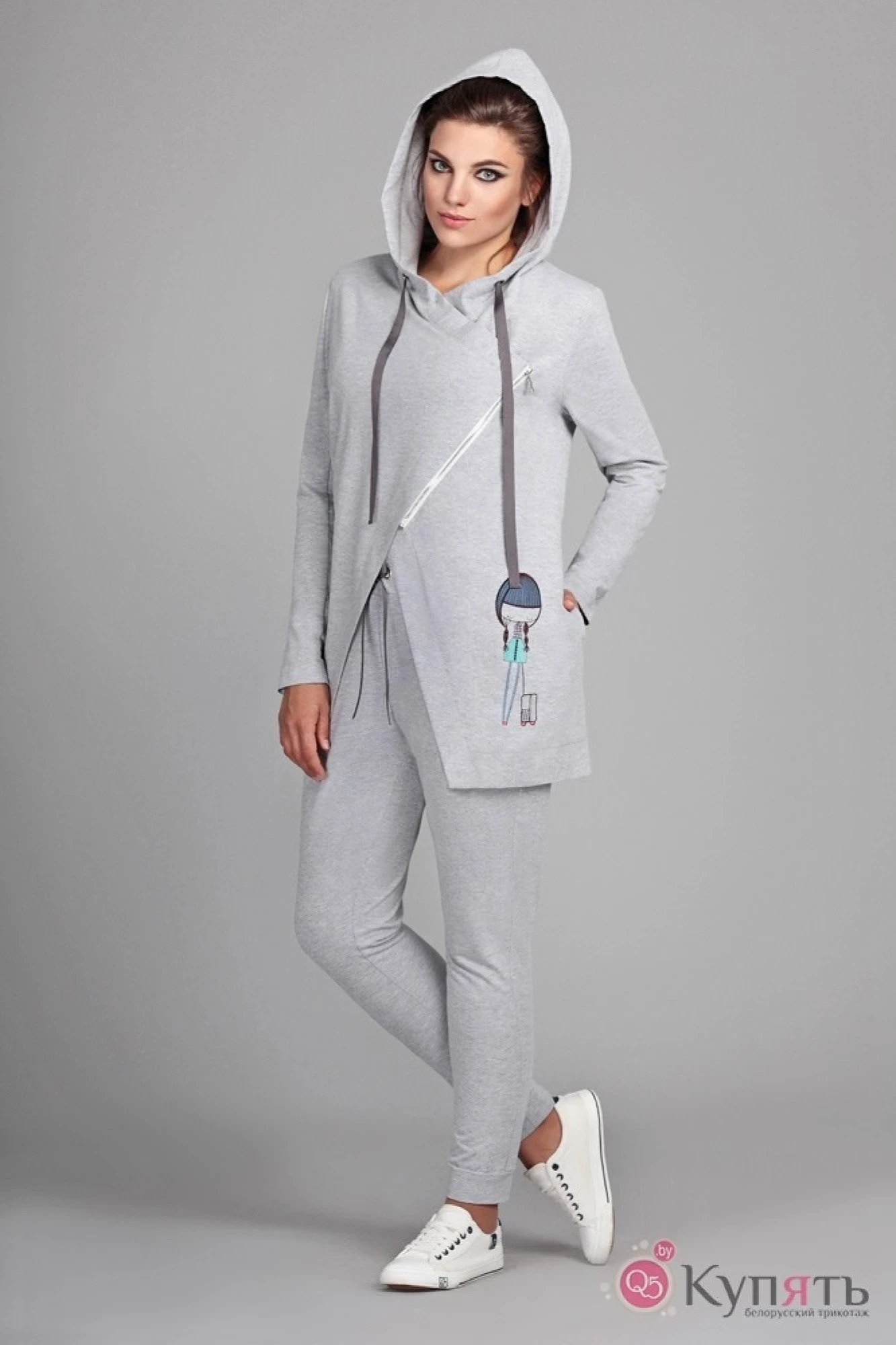 Костюм женский спортивного стиля, состоящий из кардигана и брюк. Кардиган полуприлегающего силуэта из трикотажа (тянется) с капюшоном на ассиметричной застежке на молнию.В боковых швах обработаны карманы. Брюки выполнены из трикотажа (тянется) на широком поясе, зауженные к низу на манжете. По поясу – резинка.