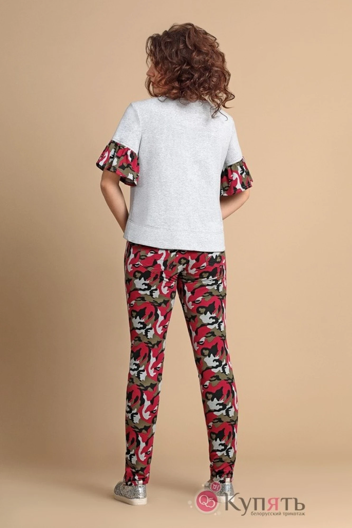 Костюм женский двух предметный, состоящий из блузы и брюк. Блуза прямого силуэта, укороченная с фигурным низом из трикотажного полотна двух расцветок (тянется). Декором служит вышивка по низу блузы. Брюки прямые на обтачном поясе, зауженные к низу из трикотажного полотна (тянется). По спинке брюк вставлена широкая резинка (7 см) и настрочены накладные карманы. Застежка на две пуговицы на поясе и гульфик на молнии.