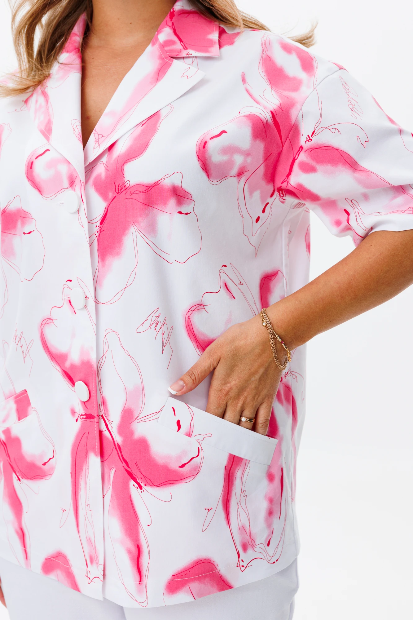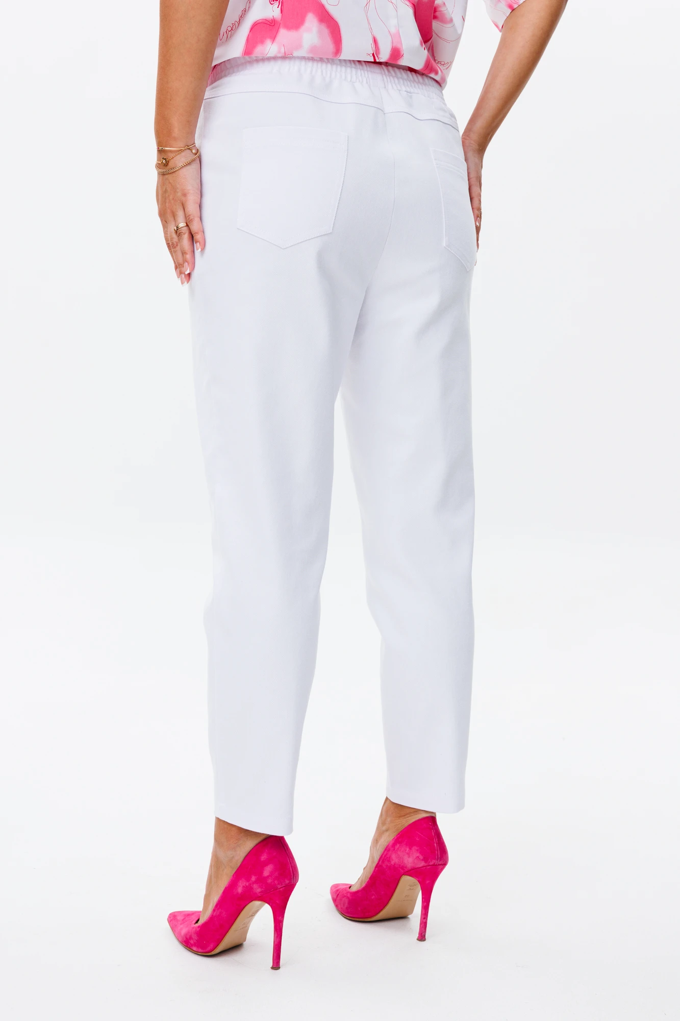 Жакет прямого силуэта со спущенной линией плеча, выполненный из хлопковой ткани (тянется). По переду функциональные прорезные карманы с листочкой, централная застежка на петли-пуговицы. Горловина оформлена воротником пиджачного типа с лацканом. Спинка со средним швом. Рукава одношовные, короткие. Жакет без подкладки. Брюки зауженные к низу с высокой посадкой, выполнены из джинсовой ткани (тянется). Верхний срез оформлен поясом с эластичной резинкой. Низ брюк с застроченными вытачками. В боковых швах наклонные карманы. По задним половинкам отрезные кокетки и накладные карманы.