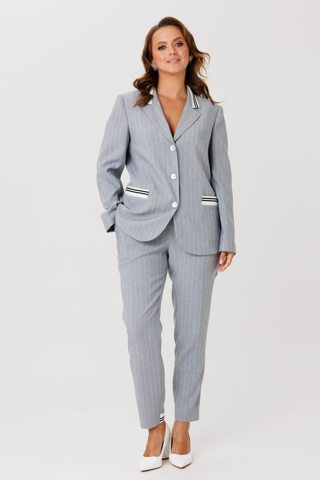 Костюм женский, состоящий из жакета и брюк, изготовлен из костюмной ткани (чуть тянется) в полоску.