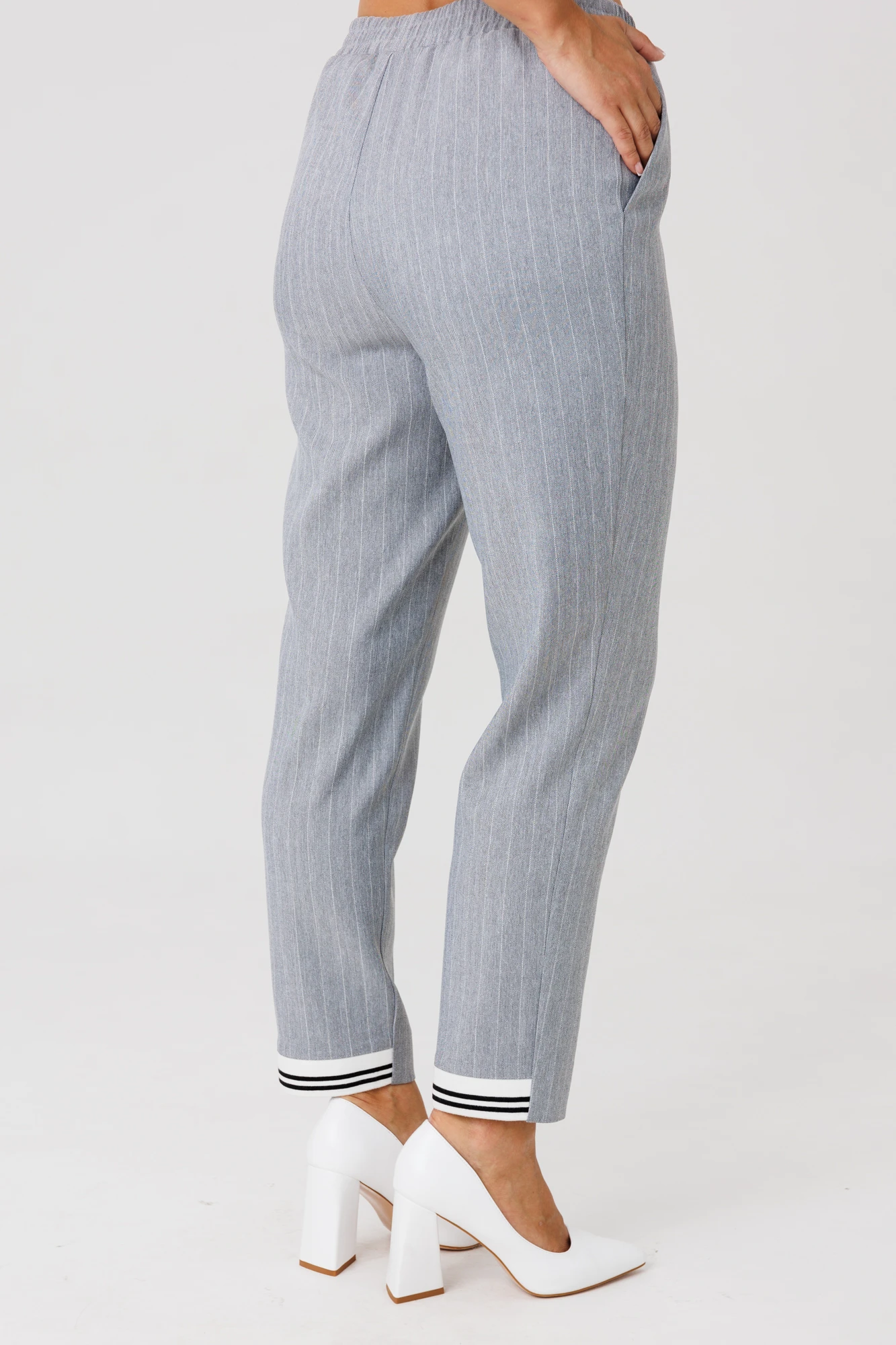 Брюки с высокой посадкой, зауженные к низу. В боковых швах функциональные карманы. Верхний срез брюк обработан притачным поясом на резинке