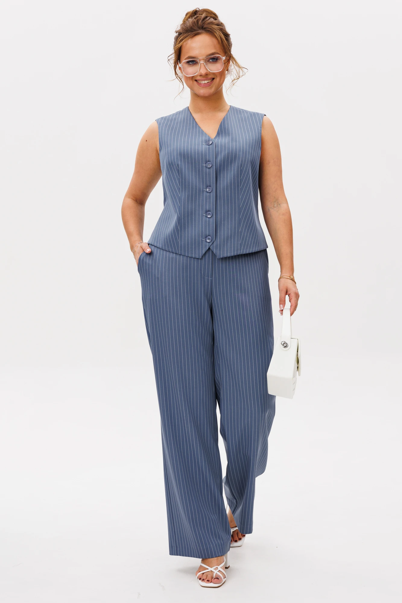Костюм женский состоит из жилета и брюк, выполнен из костюмной ткани (тянется) в полоску.
